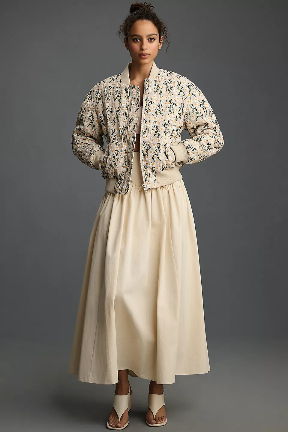 A beige floral quilted bomber jacket that gives a soft retro feel. The short length and dropped shoulders make layering easy. A full zip with ribbed collar, cuffs and hem keeps you warm, and slanted pockets keep your hands warm. Pair with denim during the day or wear over a dress for a playful contrast.