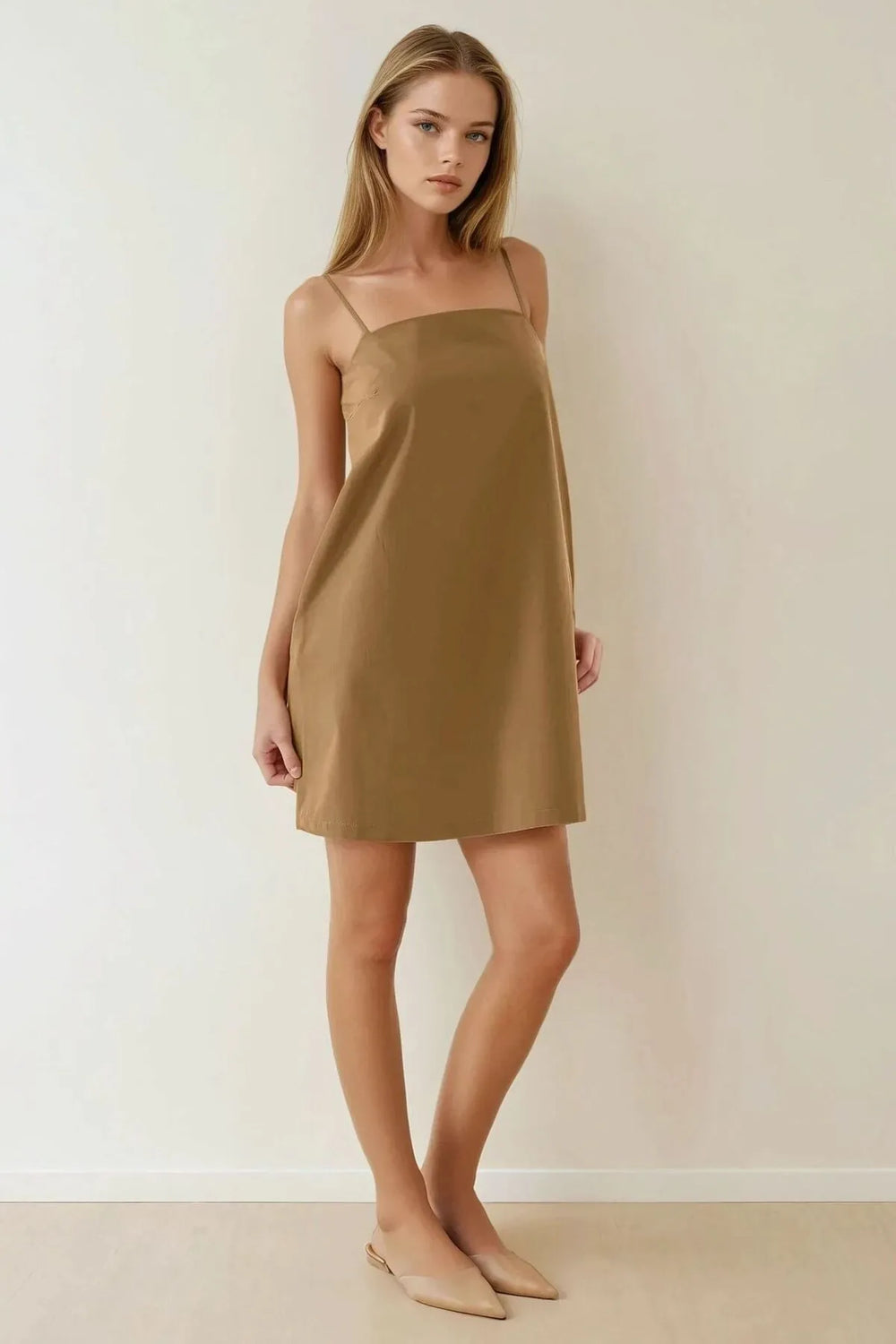 This elegant beige summer dress features a relaxed A-line silhouette and thin straps for a breezy, elegant look. Its simple design makes it perfect for warm summer days, beach trips, or leisurely strolls around town.