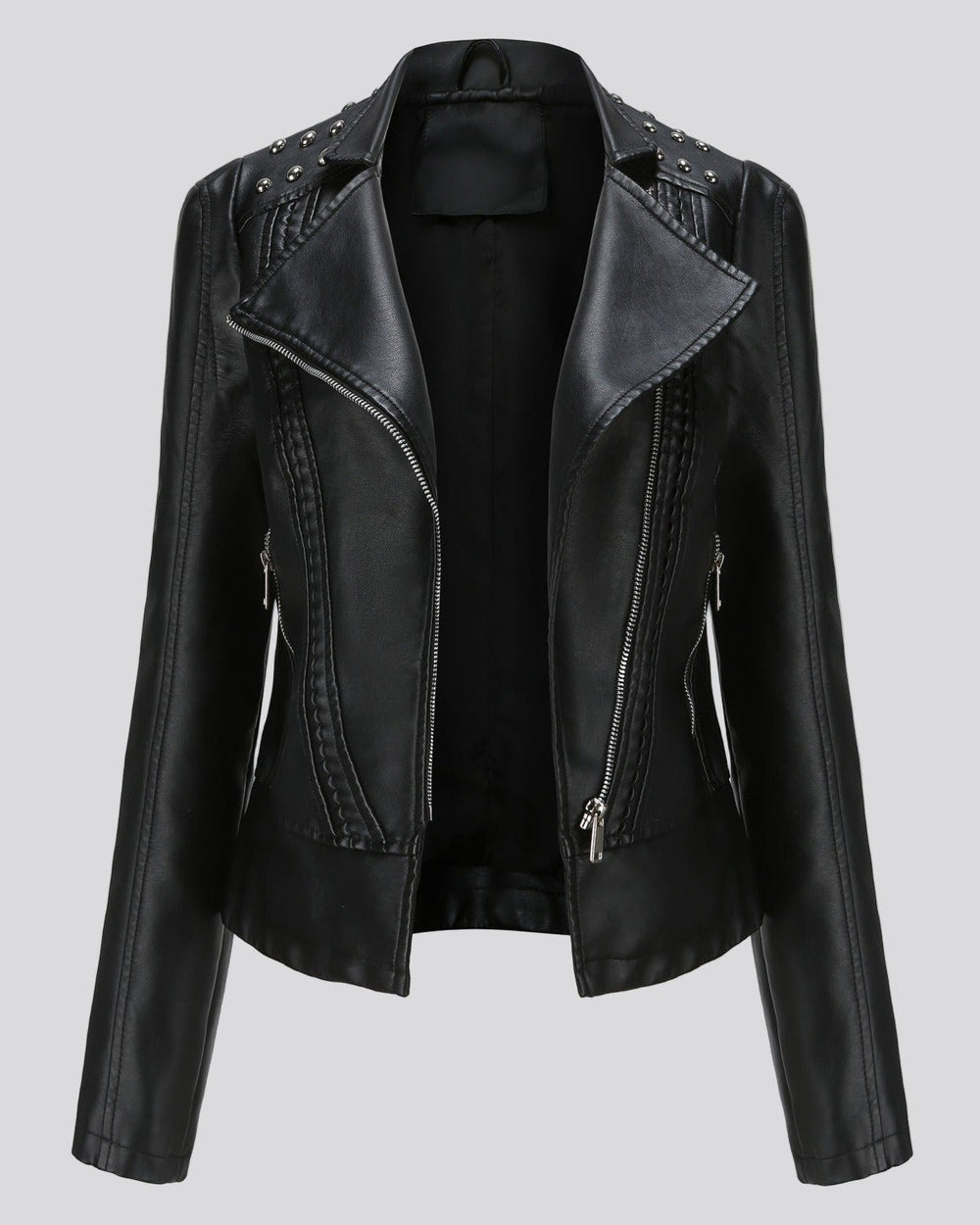 A form-fitting moto jacket with prominent seams, lacing detail at the shoulders and wide lapels. Two zip pockets at the front and a clean, hip-length fit that creates a sharp silhouette over denim or dresses.