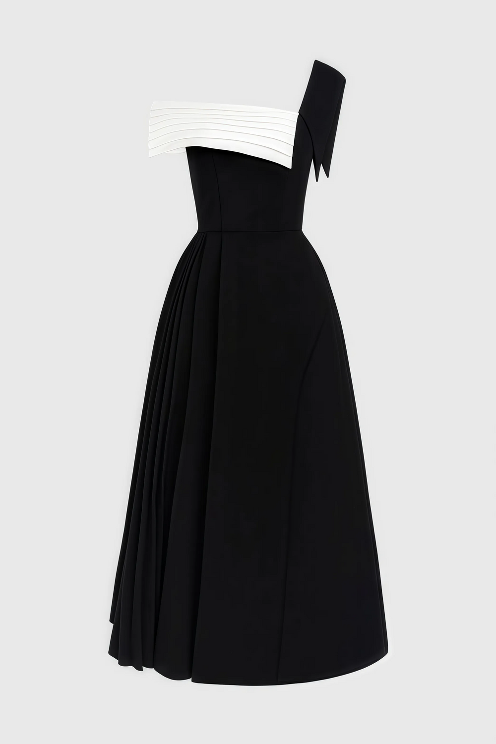 Make a lasting impression in this black and white asymmetrical strapless midi dress, featuring a unique pleated white neckline that falls off one shoulder. The fitted bodice and beautifully flared skirt create a refined silhouette, perfect for formal occasions and evening events where you want to exude timeless elegance.