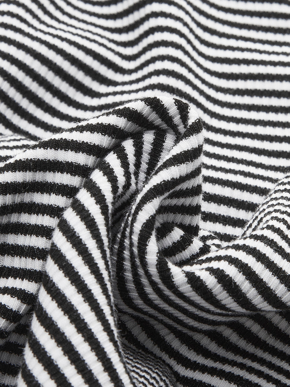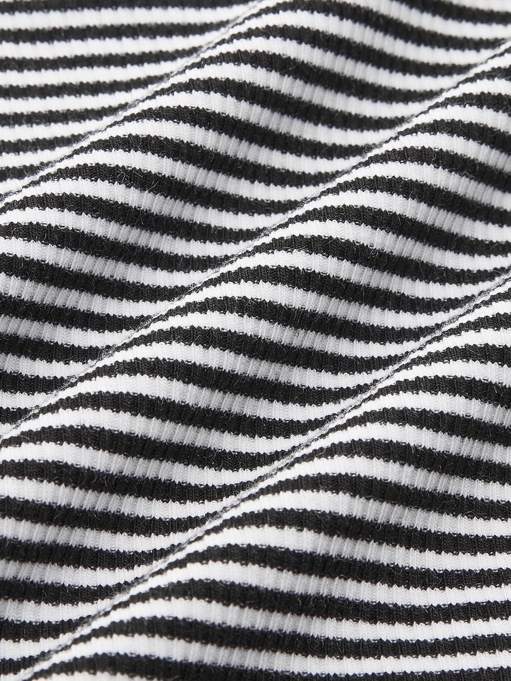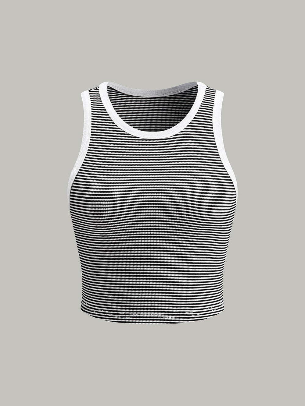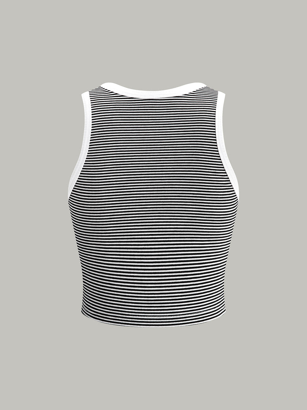 A modern black and white striped cropped tank top with contrast piping. Its fitted cut and timeless pattern create a sporty yet elegant look, ideal for everyday wear as well as casual activities.