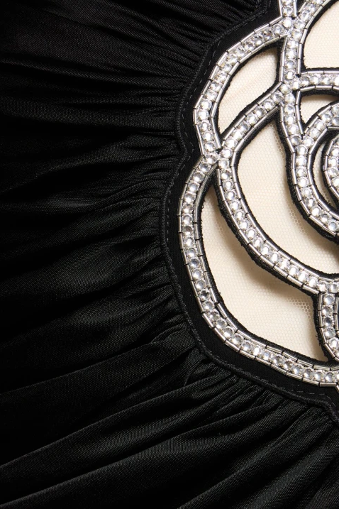 Elegant black asymmetrical mini dress with one shoulder and an elegant rose appliqué on the hip. Thanks to its dramatic back length and fitted cut, this dress is perfect for parties and exclusive evenings where you want to make a splash.