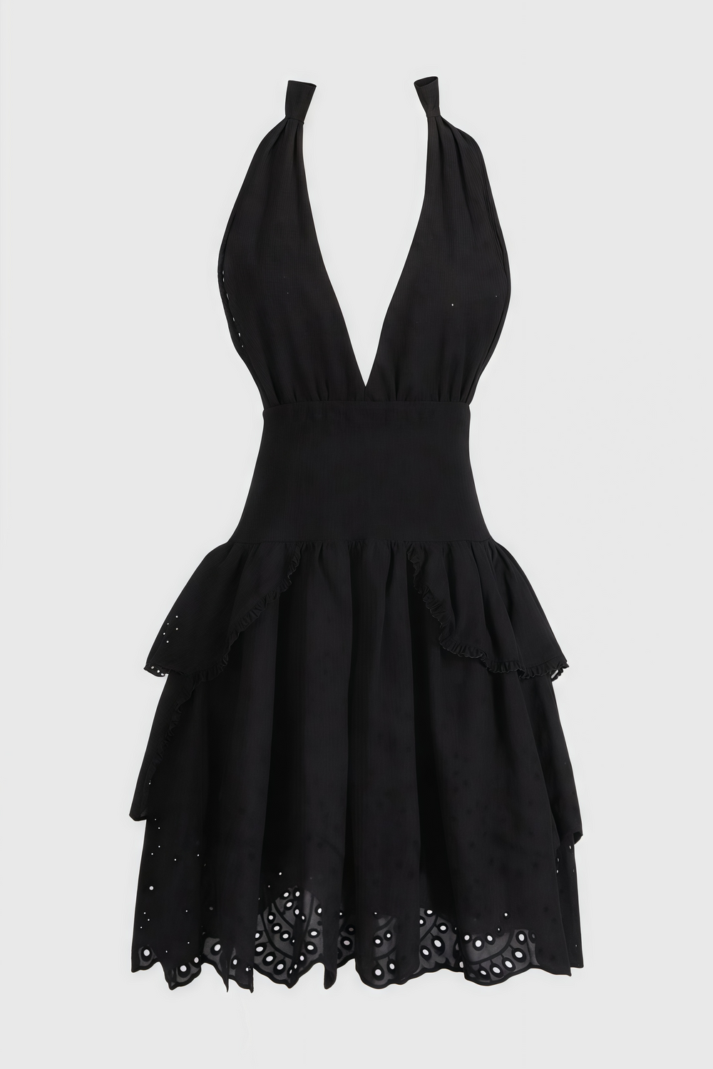 This elegant black mini dress features a plunging neckline and a beautifully embroidered ruffled skirt. Its defined waist and scalloped edges give it a feminine and sophisticated touch, perfect for parties and summer special occasions.