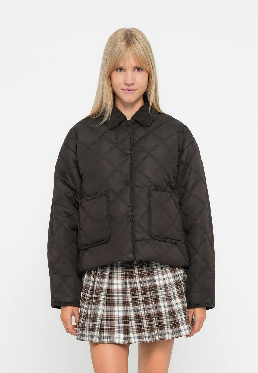 A boxy hip-length jacket with elegant diamond quilting and a softly textured collar that frames the neck. Clean snap closure, spacious patch pockets for mobile and keys and light padding that warms without being bulky. Loose sleeves make it easy to wear over knitwear and T-shirts - an everyday garment that feels both stylish and cozy.