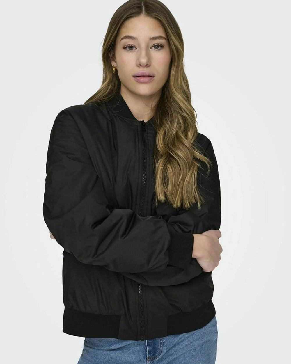 Relaxed bomber in black with a straight, oversized silhouette. Ribbed cuffs, collar and hem, full zip front and slanted side pockets. Hip length that's easy to style over sweaters and hoodies for a clean, urban look - perfect for everyday and evening wear.