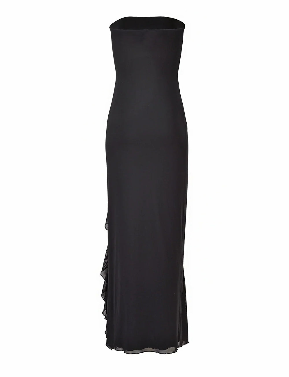 A sophisticated black strapless maxi dress with a fitted silhouette and a high front slit. The dress is adorned with ruffles along the slit, creating elegant movement and adding an extra touch of glamour. Ideal for parties or occasions where you want to display timeless elegance with a modern twist.