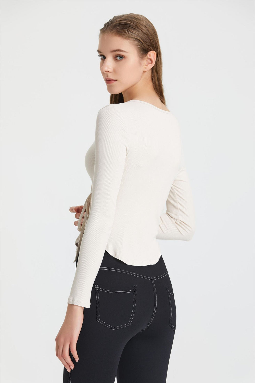 This long-sleeved wrap top features a unique asymmetrical neckline and an elegant side tie. Made from a breathable, lightweight material, it offers comfort and freedom of movement, perfect for casual or more formal styles.