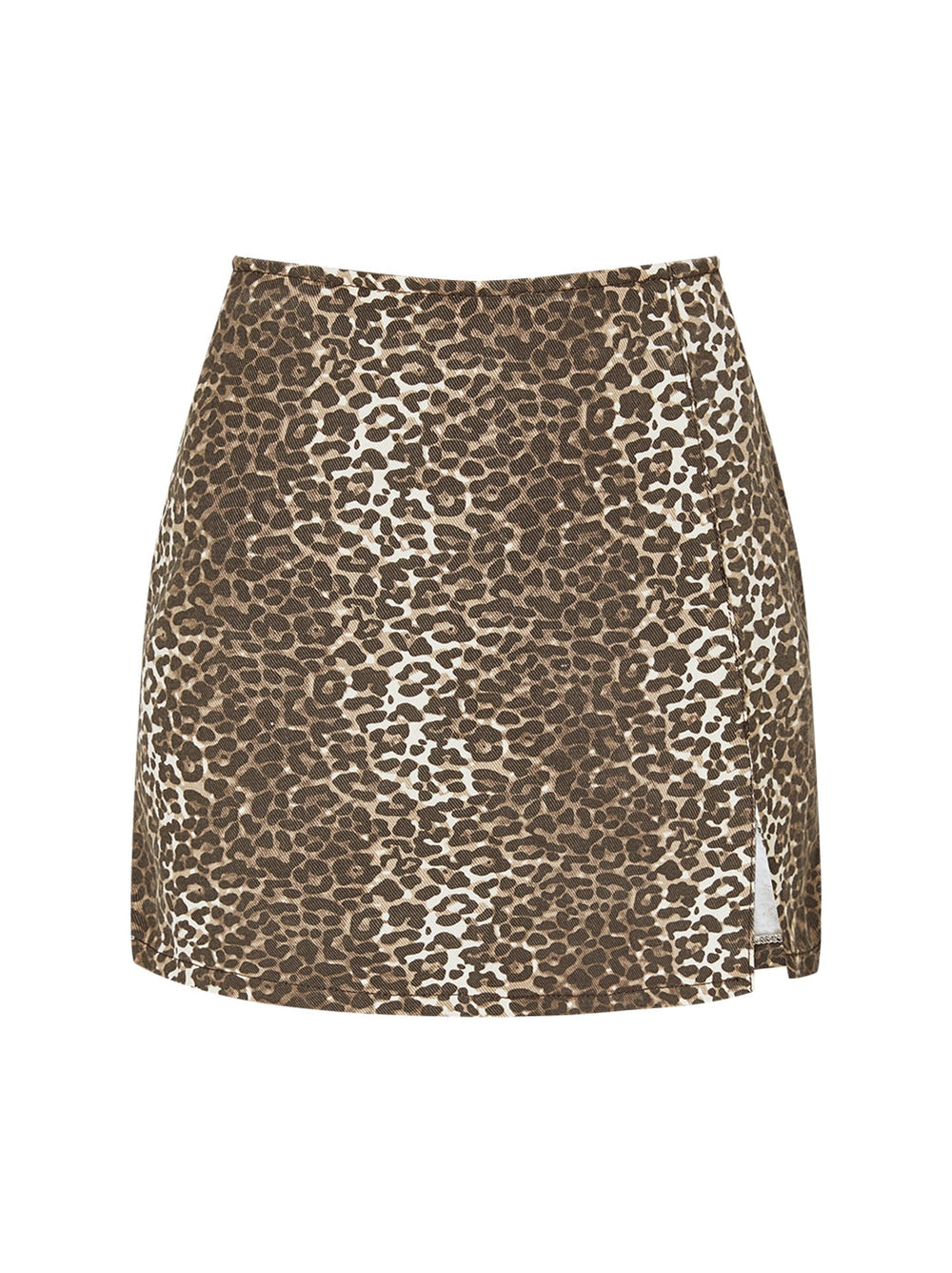 Fitted mini skirt in brown leopard print, enhanced with a side slit to lengthen the leg. Highlighted waist and short length for a bold look from everyday to evening.