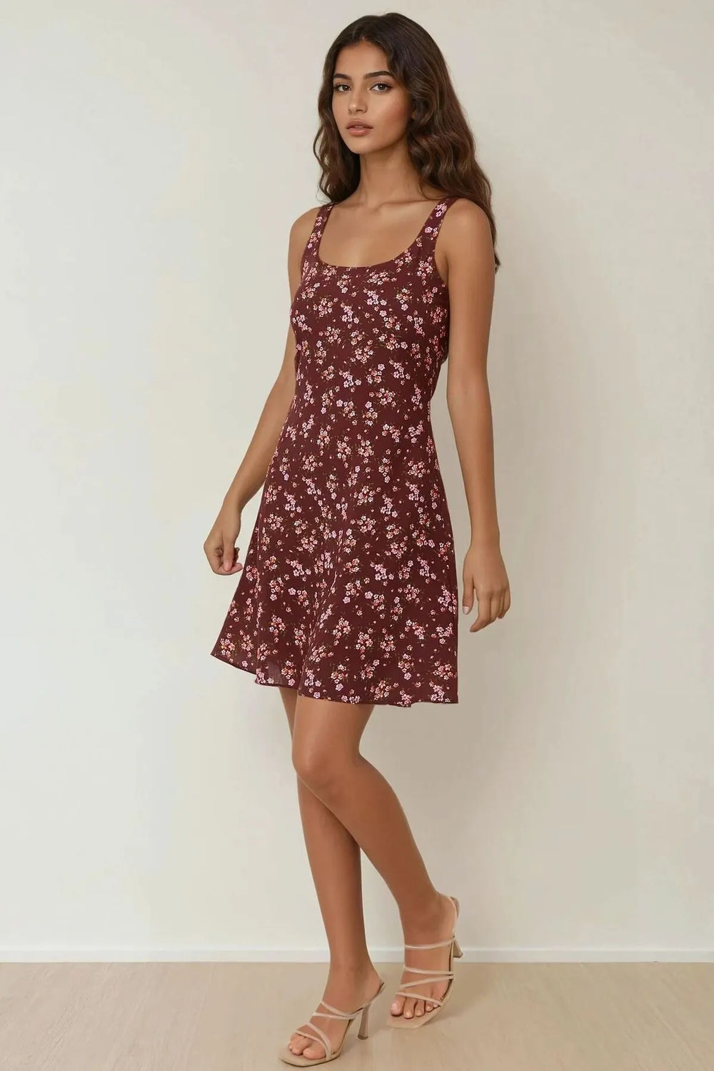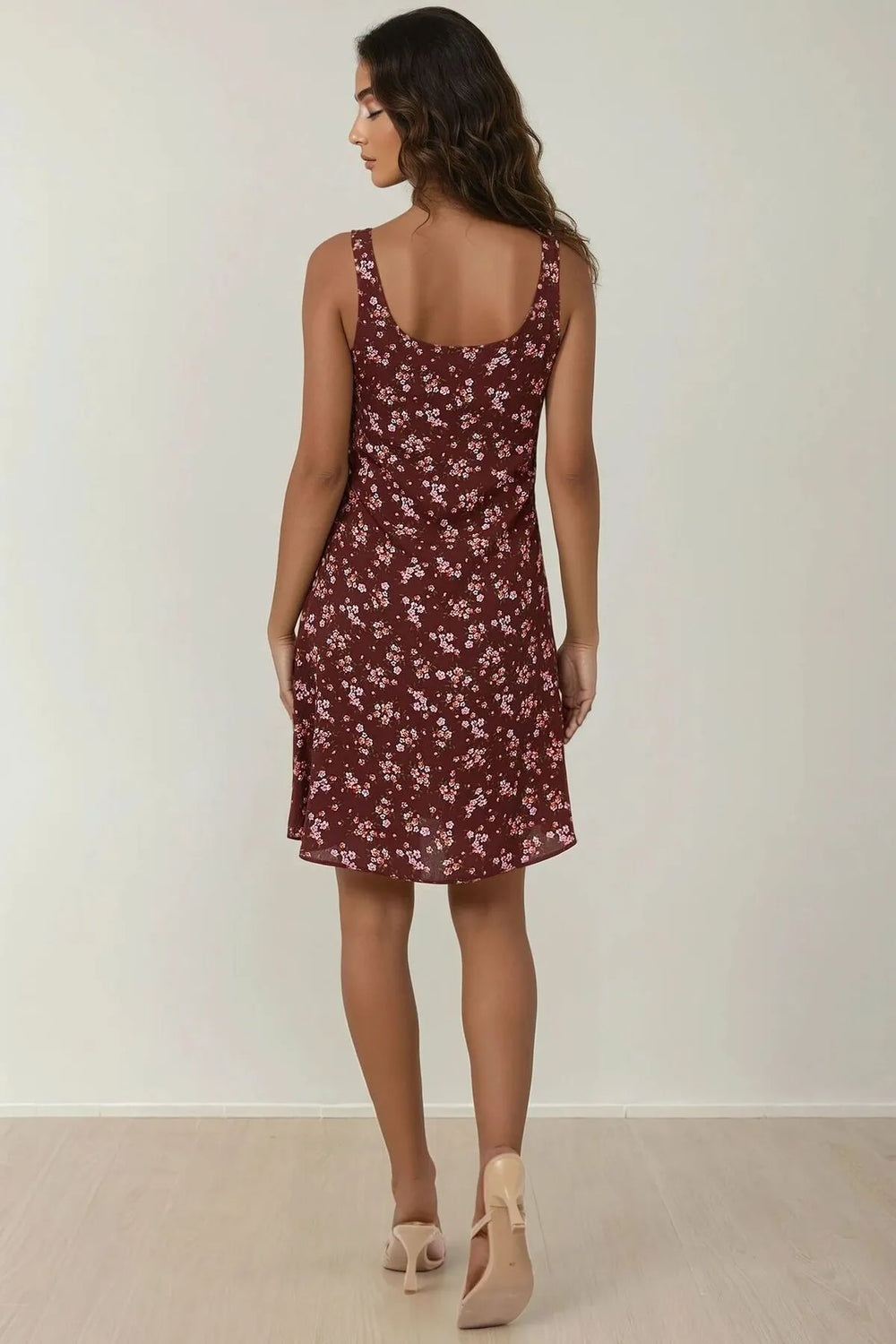 This romantic burgundy floral summer dress features spaghetti straps and a slightly flared silhouette for a feminine, relaxed look. This dress is perfect for sunny days, picnics, and summer outings.