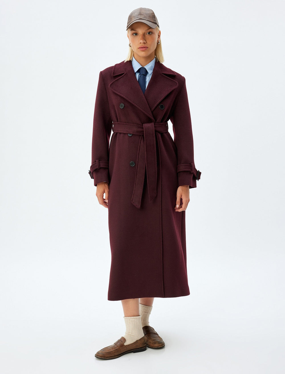 Elegant, full-length trench coat in burgundy with double-breasted fastening, wide lapels and a removable tie belt that defines the waist. Has adjustable straps at the cuffs and a straight hem that gives a tailored silhouette. Perfect for cooler days when you want to be both warm and well-dressed, and easy to wear over work clothes, dresses or knitwear for a stylish city style.