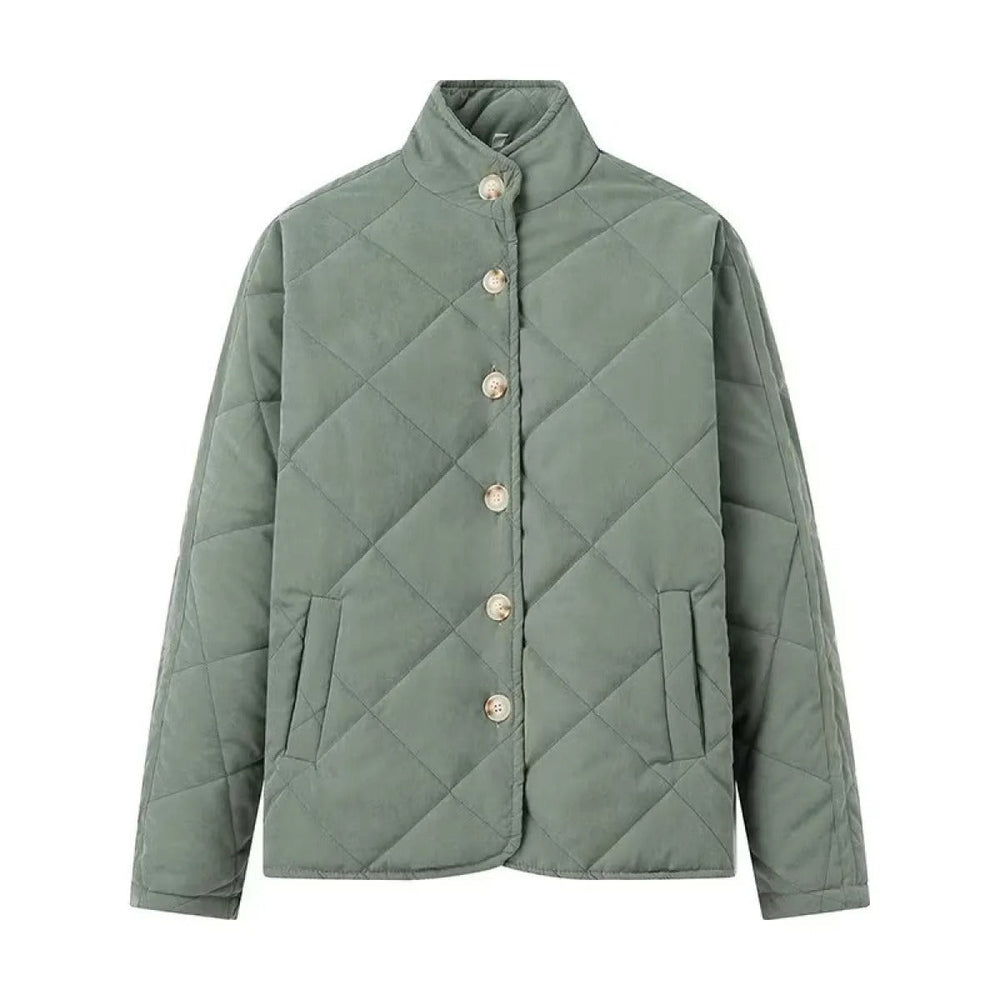 A stylish quilted jacket that warms without being bulky. The stand-up collar protects against wind and the buttoning at the front gives a clean expression that is easy to layer. The diamond quilting shapes a smooth silhouette and practical inset pockets keep the most important things close. Finished with a slightly rounded hem and roomy sleeves for comfortable movement in everyday life.