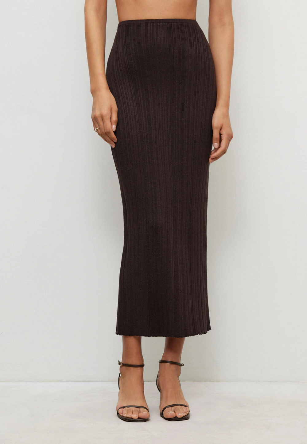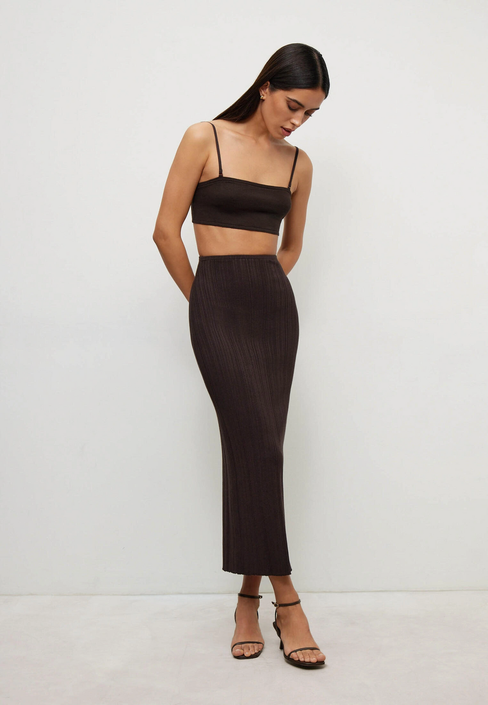 This timeless maxi skirt features a flattering ribbed structure and a fitted silhouette. Its elegant length and minimalist look make it a versatile piece, perfect for everyday wear as well as special occasions.