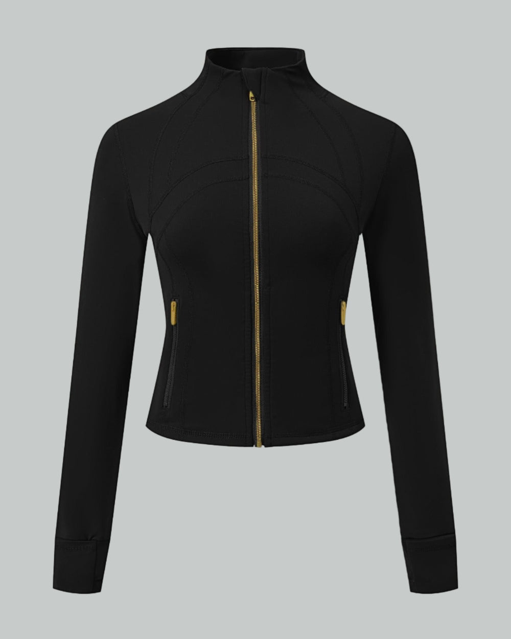 A fitted jacket with a full zip that shapes the silhouette with panelled seams and a defined waist. A high collar and two zip pockets give a sporty, elegant feel. Waist length that sits nicely over tights and denim for a clean, stylish look.