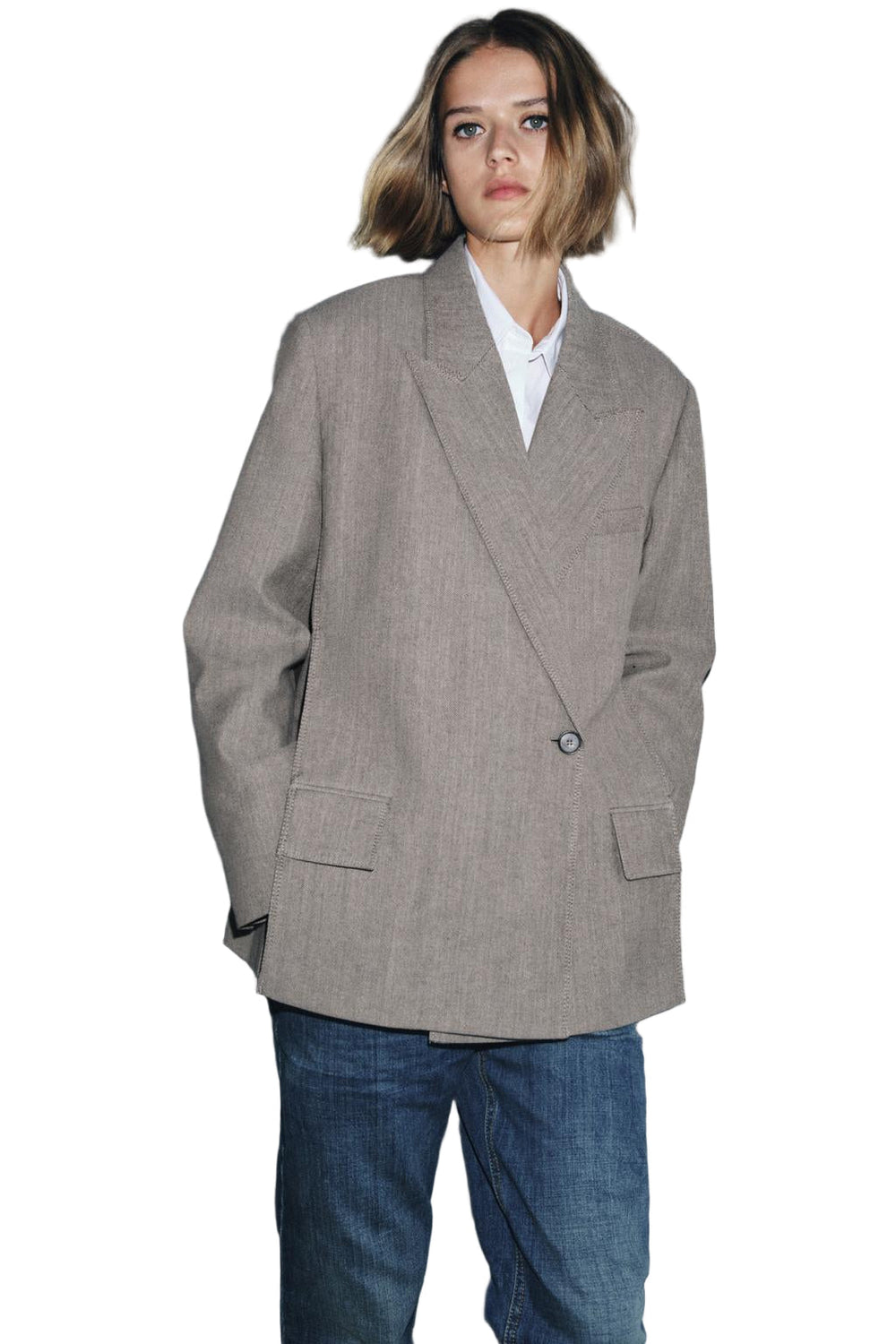 A casual, tailored blazer in gray with a single button fastening, defined shoulders and practical pockets with flaps. The slightly longer and wider fit gives a modern and relaxed feel that goes just as well with jeans as with suit pants or over a dress. Perfect for work, everyday wear in the city or as a light layer between seasons.