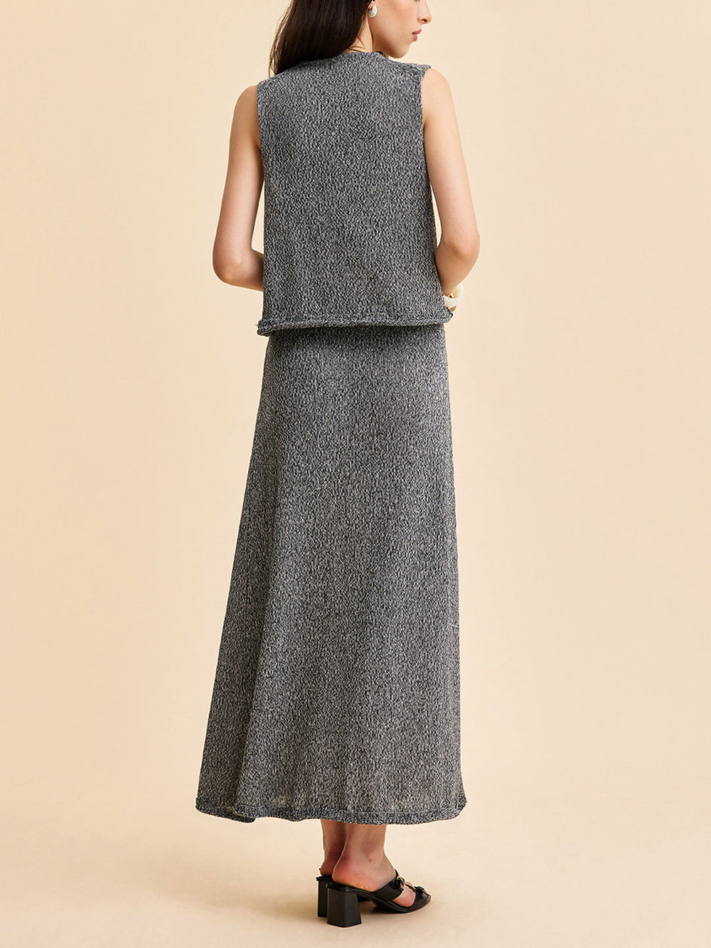 This elegant set includes a sleeveless tie-front top and a matching gray maxi skirt for a stylish yet casual look. Ideal for everyday wear or summer evenings.