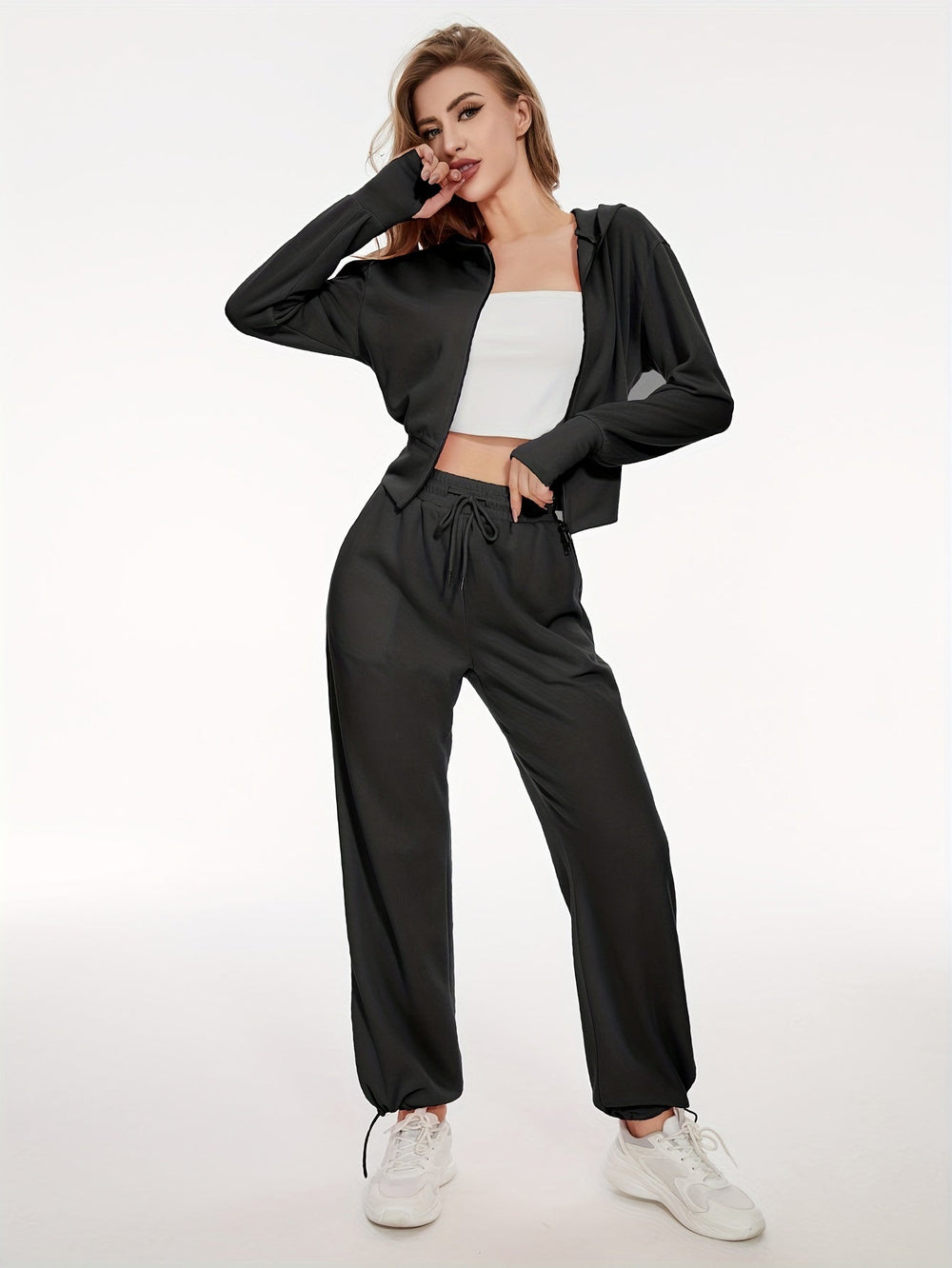 Casual set consisting of a cropped zip-up hoodie and wide-leg pants with a drawstring waist. Its soft material makes this set comfortable both at home and in everyday life, while its design gives it a modern and elegant look.
