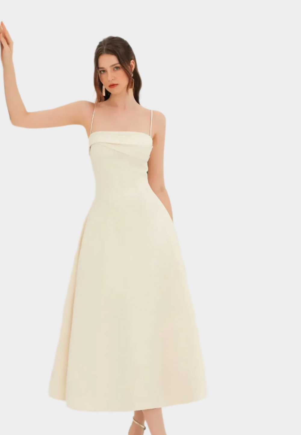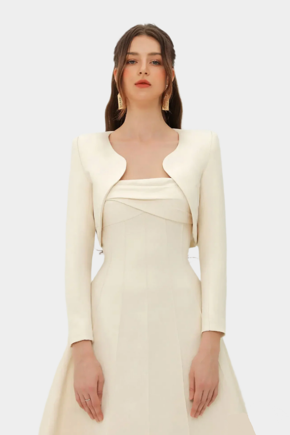 Exude elegance with this ivory midi dress with a draped neckline and matching long-sleeved bolero. Its structured silhouette and soft ivory color make it ideal for special occasions, formal evenings, or chic outings. Timeless style and sophistication blend perfectly in this beautiful design.