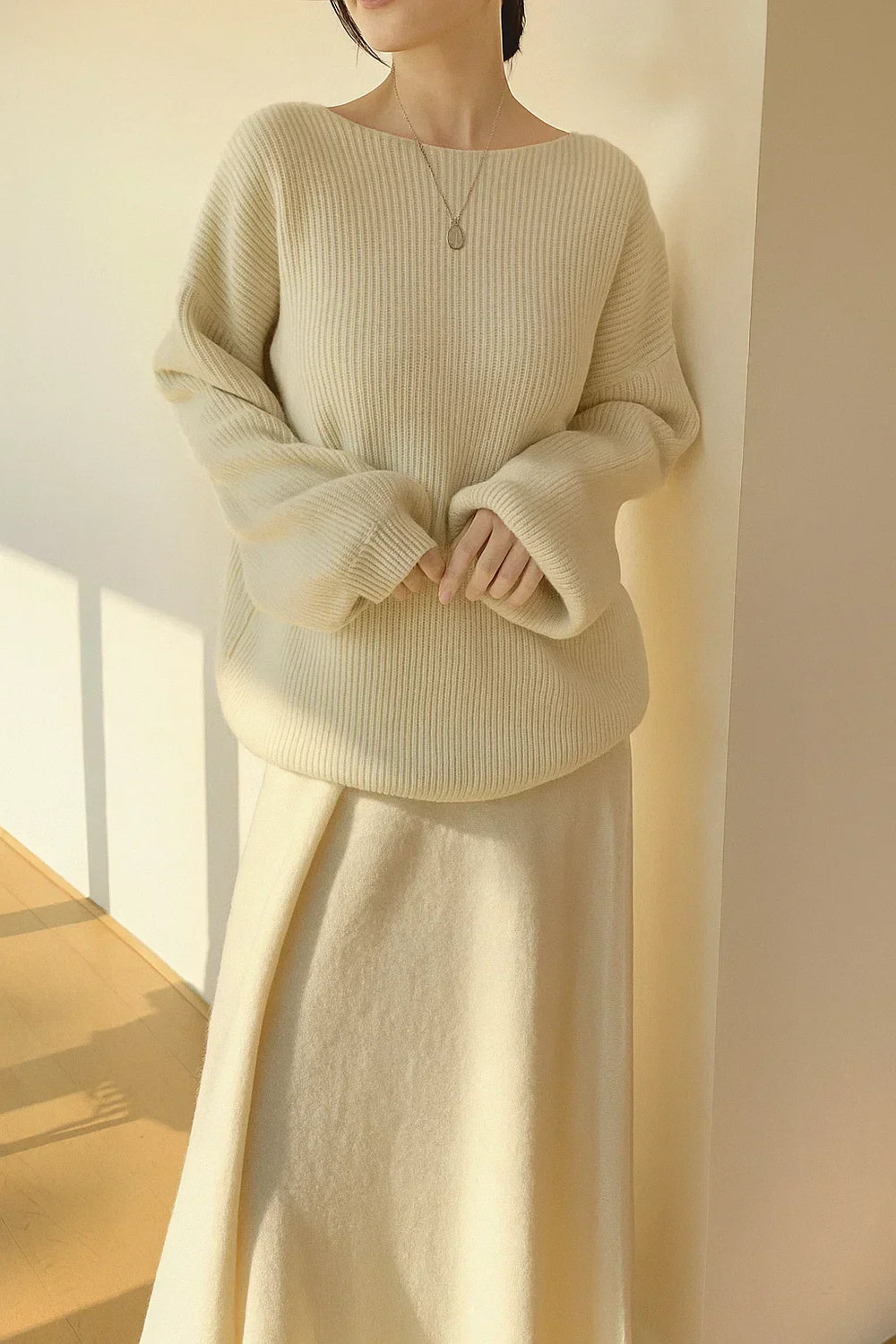 Achieve an effortlessly elegant look with this knitted sweater and flared skirt set. The loose, oversized sweater features a fine ribbed weave and dropped shoulders, while the high-waisted, flowing skirt offers comfort and elegance. Perfect for cozy days, casual moments, or to subtly elevate your everyday look.