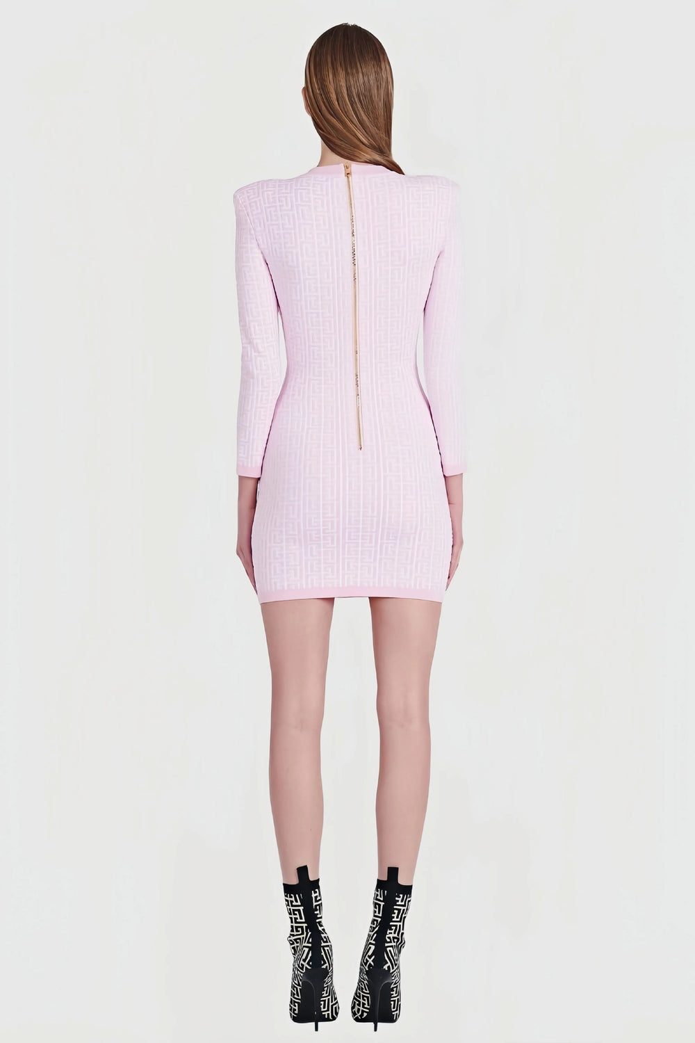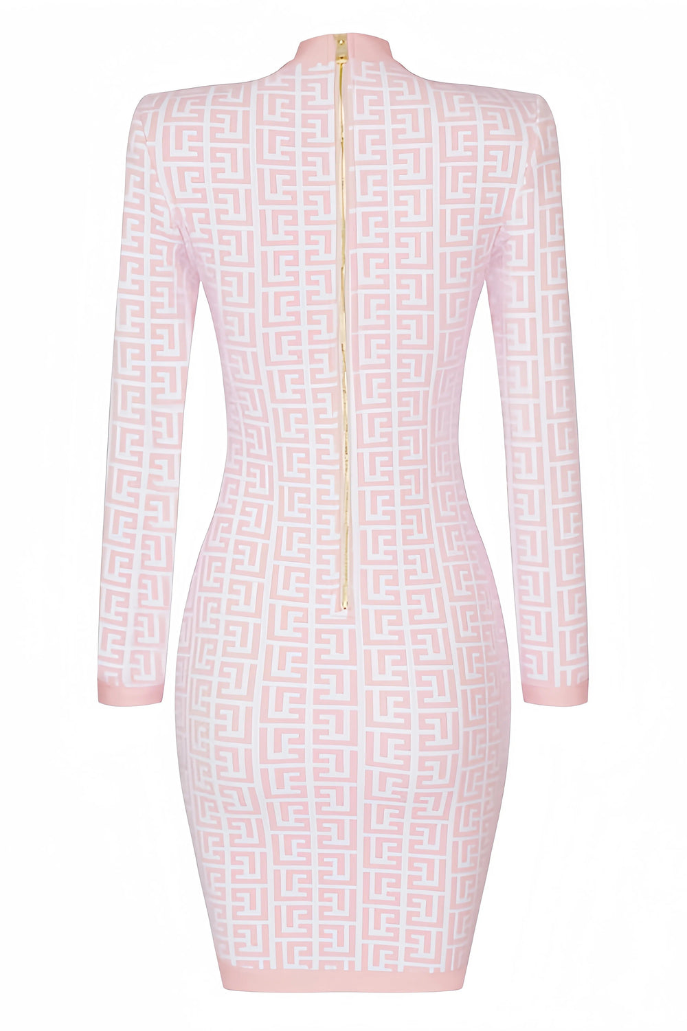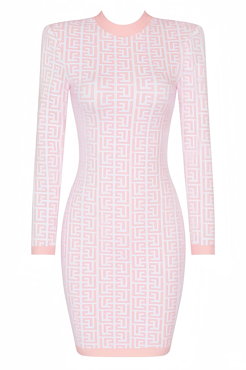 An elegant, fitted light pink dress with a subtle graphic pattern that gives it a modern and refined look. Its fitted cut and long sleeves create an elegant and feminine look, perfect for dinner parties and formal occasions alike.