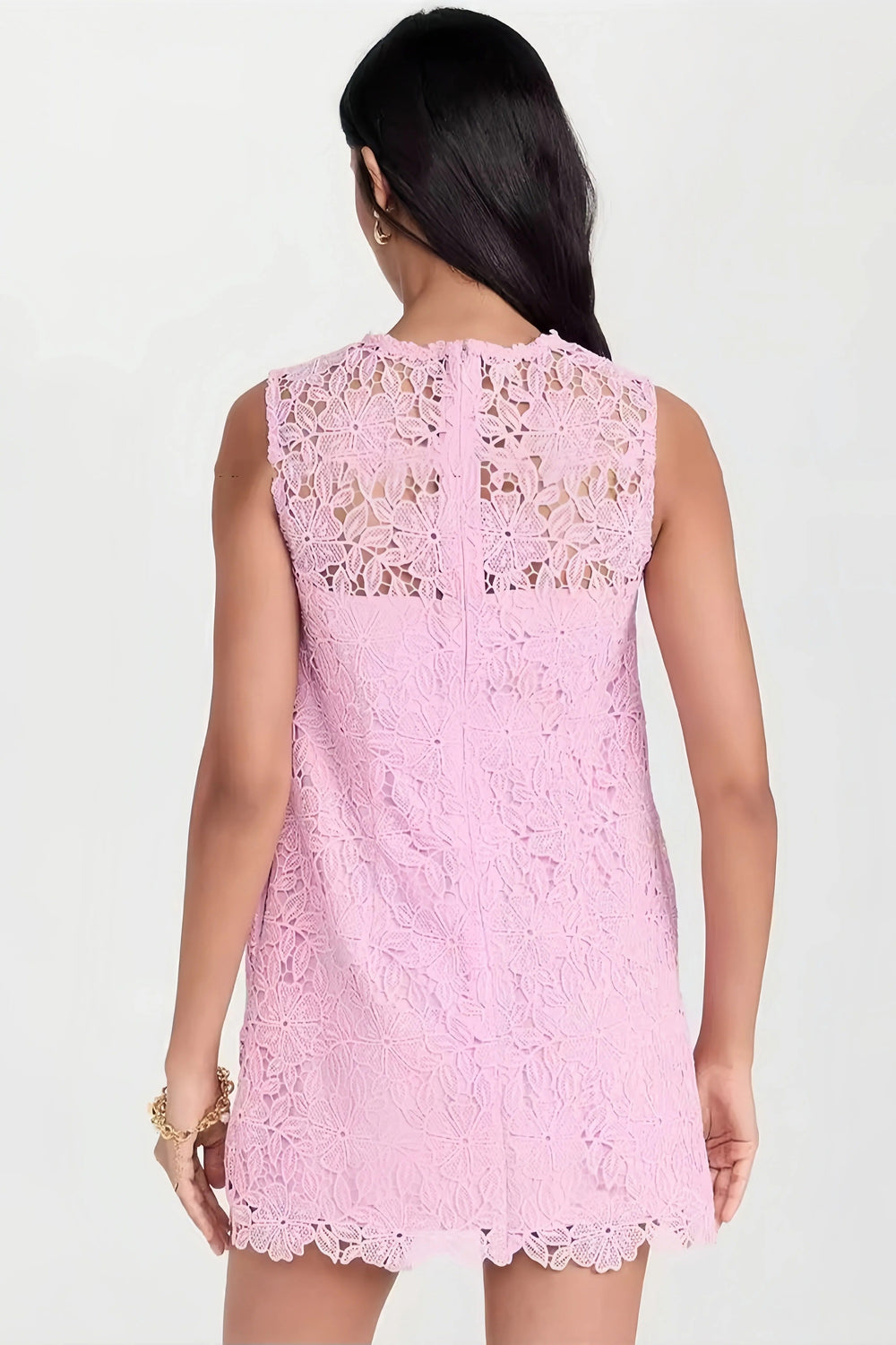 Charming light pink lace mini dress, sleeveless and featuring decorative pockets. The elegance of the lace and the softness of its color create a romantic and luxurious look, perfect for summer parties and special occasions.
