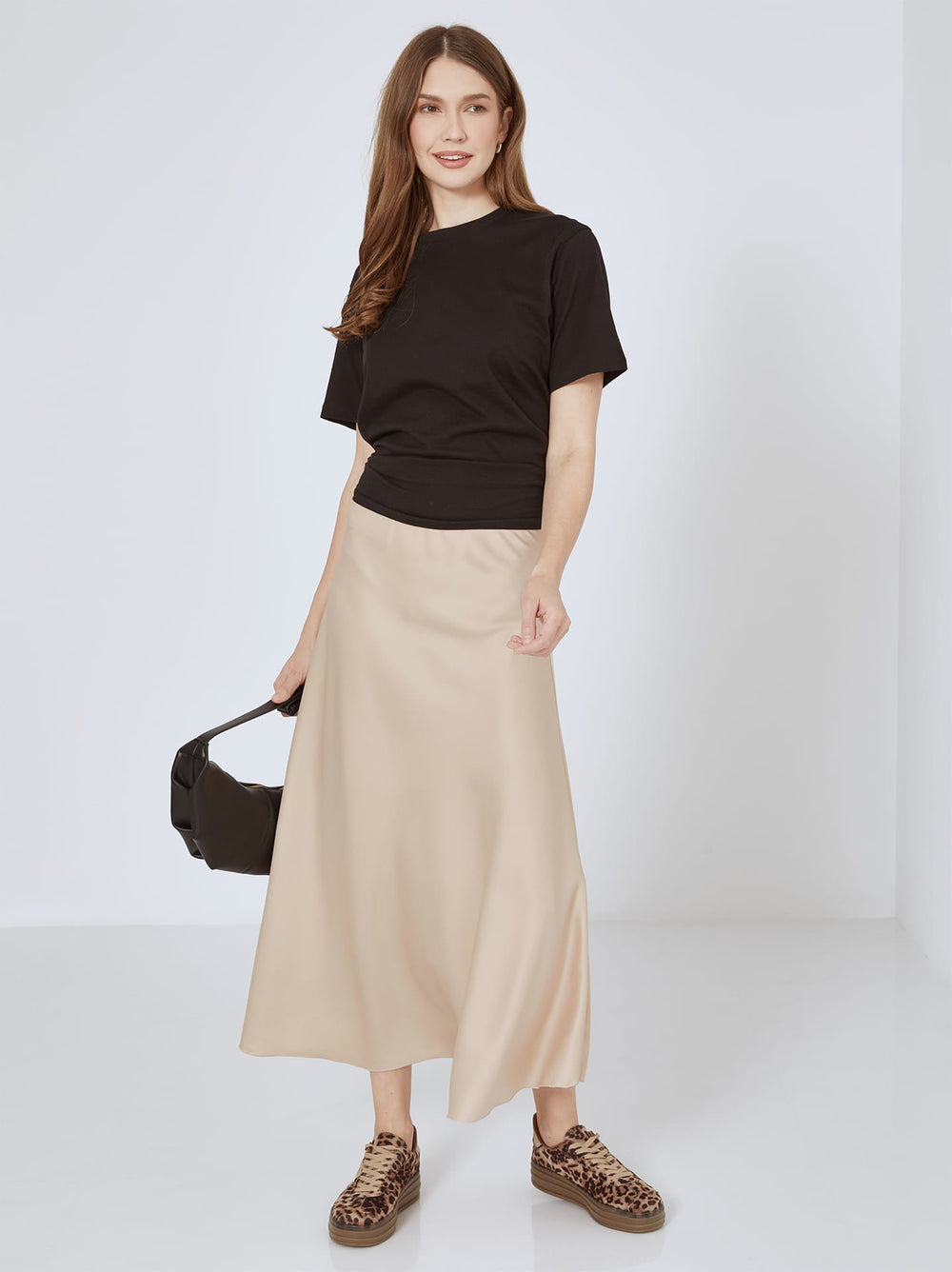 Timeless elegance and comfort come together in this long satin skirt. Its flowing cut and minimalist design make it ideal for everyday and chic outfits alike.