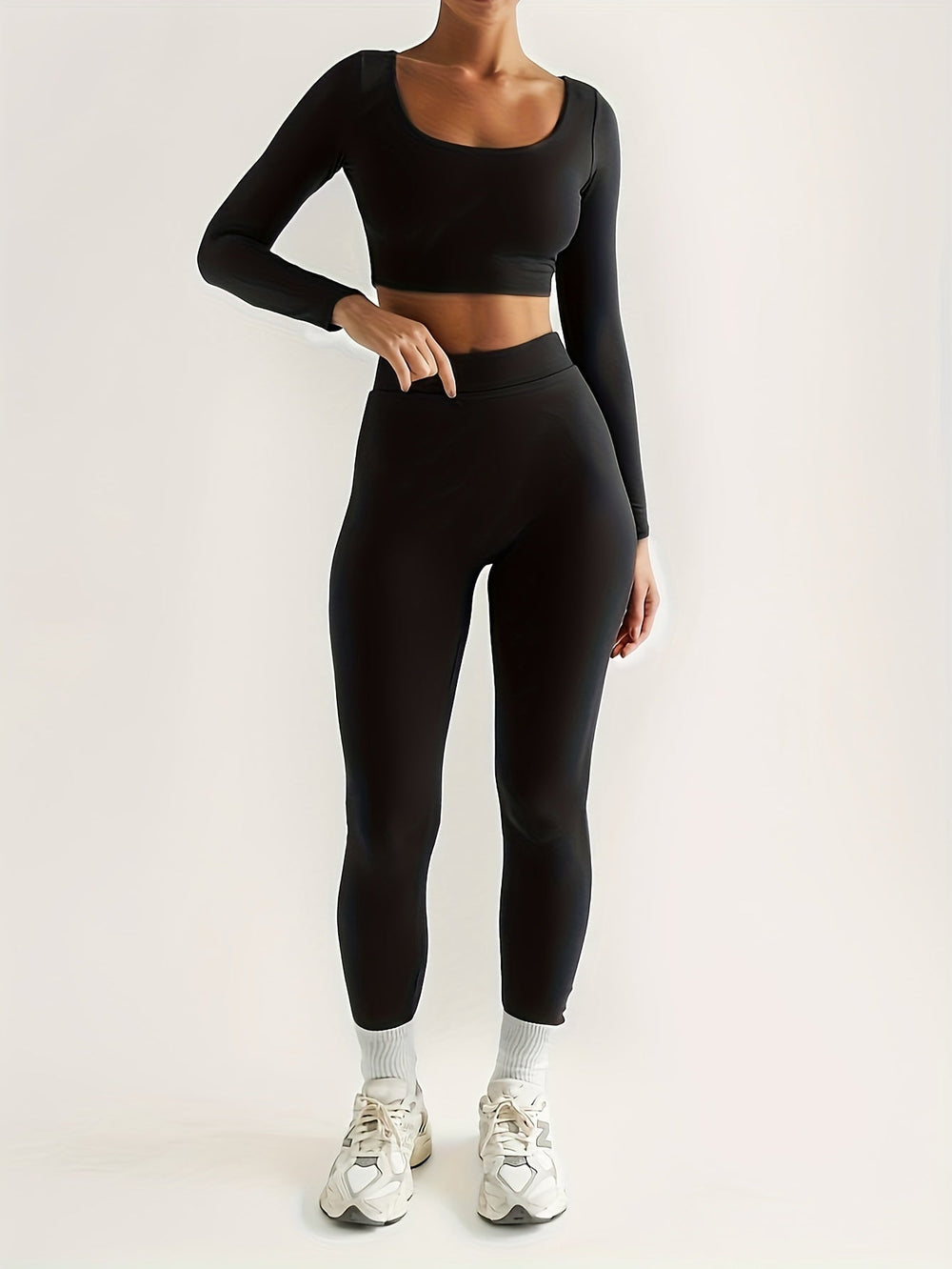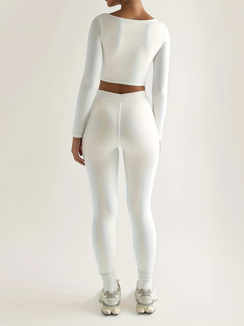 Stylish and functional sports set consisting of a long-sleeved crop top and cropped leggings made of soft, stretchy material. This comfortable, fitted set offers complete freedom of movement during training, yoga, or other athletic activities. Ideal for those looking for a stylish and comfortable set for the gym and daily workouts.