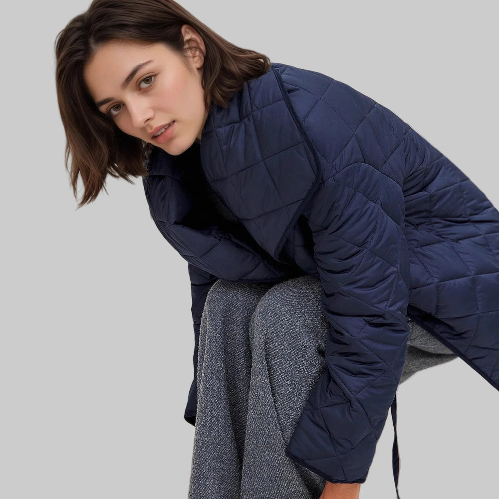 A modern navy jacket with diamond quilting and a pronounced shawl collar that falls neatly and ties at the front. The boxy hip length is easy to wear over knitwear and the loose sleeves create a comfortable silhouette. Light padding warms without being bulky, and the clean lines create a stylish, city-ready expression for both everyday and weekend wear.