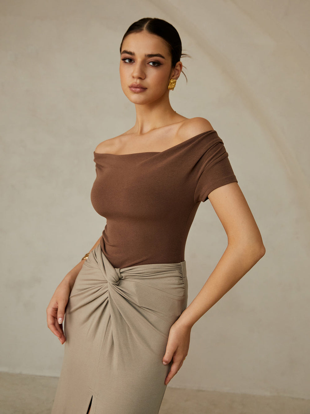 An elegant top with a fitted cut and off-the-shoulder detailing that elegantly accentuates the silhouette. This timeless style is suitable for both everyday and evening wear and pairs easily with a variety of trousers for a chic look.