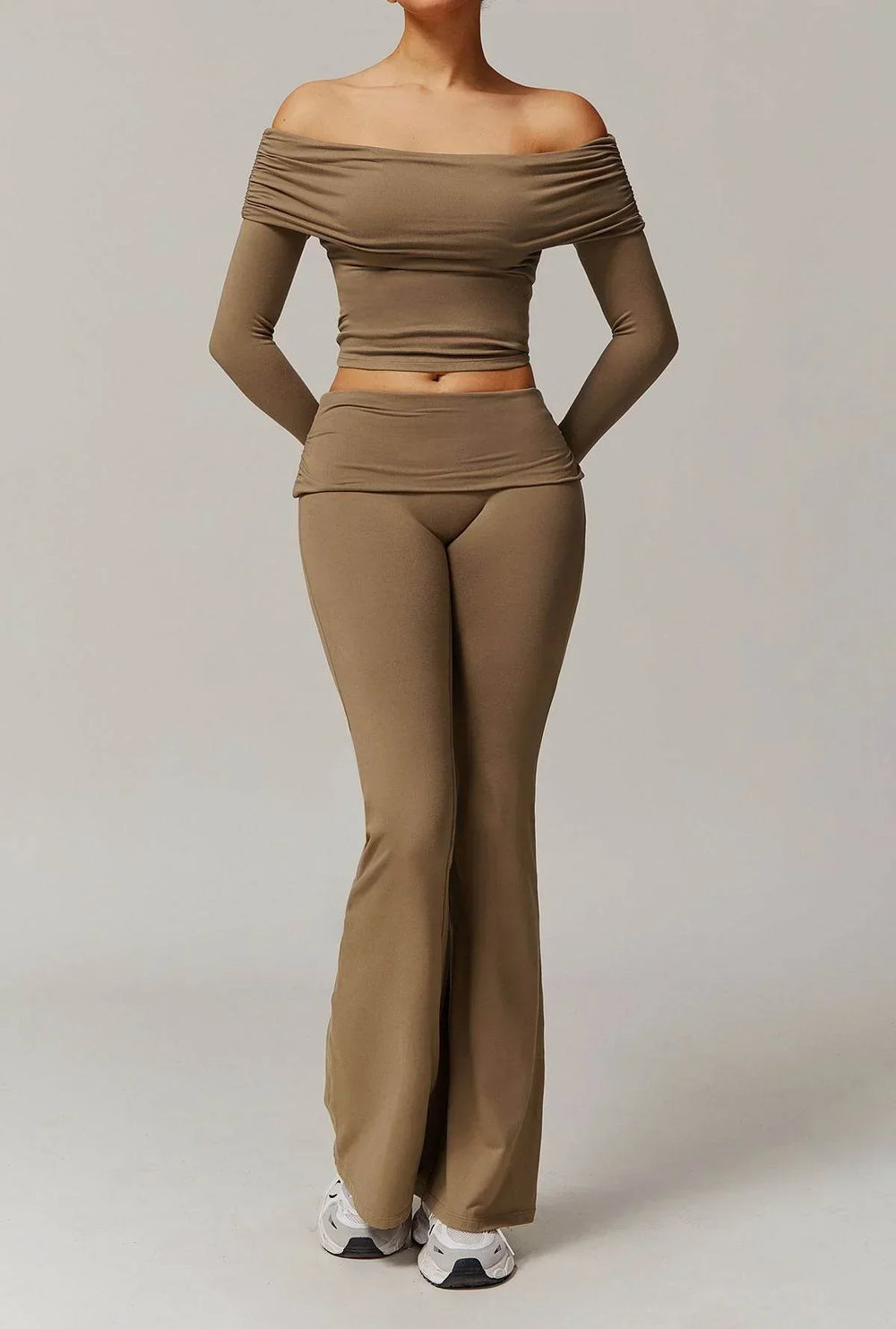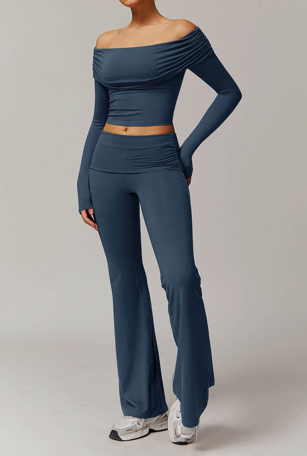 This stylish set includes a long-sleeved off-the-shoulder top and matching flared pants. Its sleek details give it a modern look, perfect for a trendy and comfortable look.