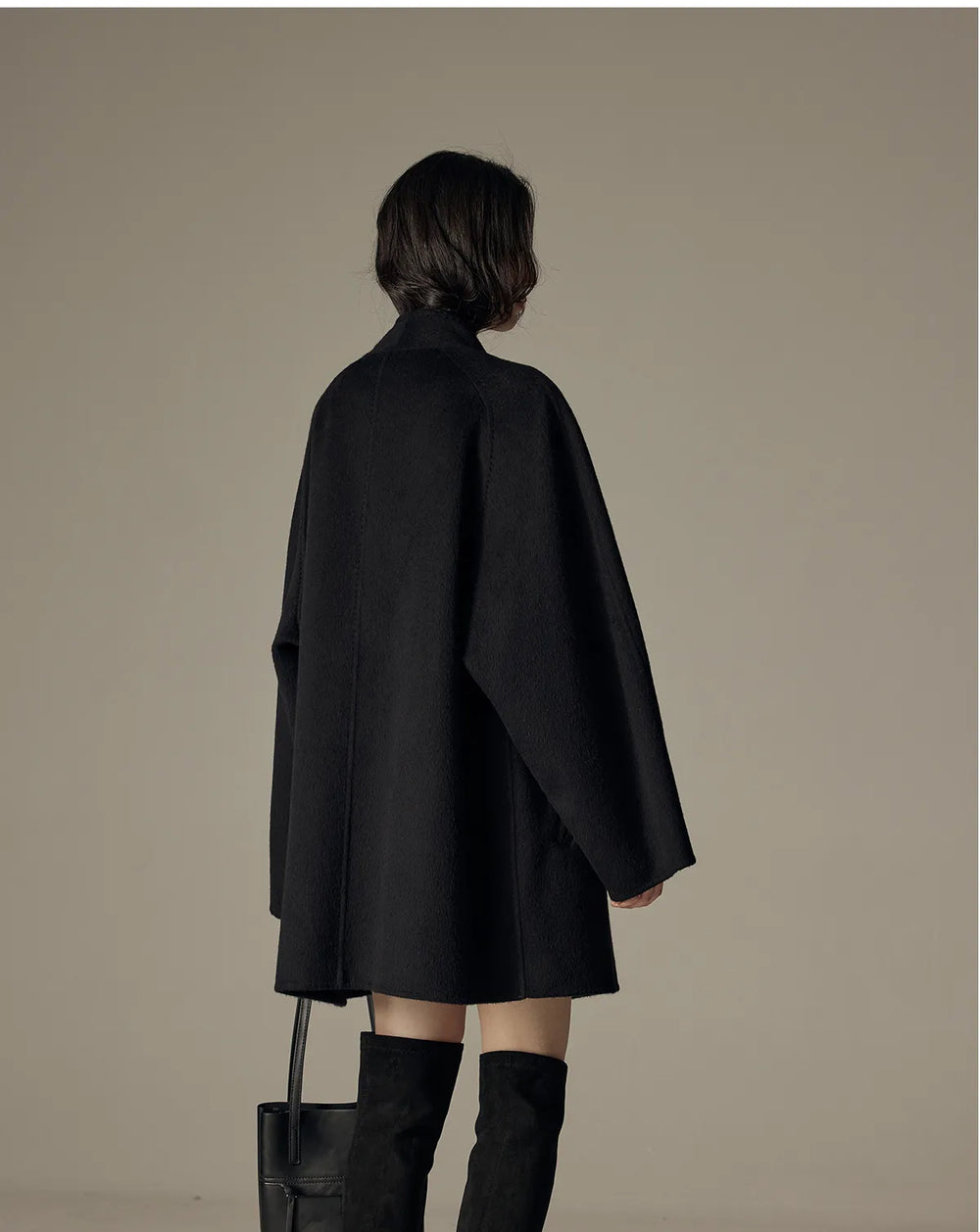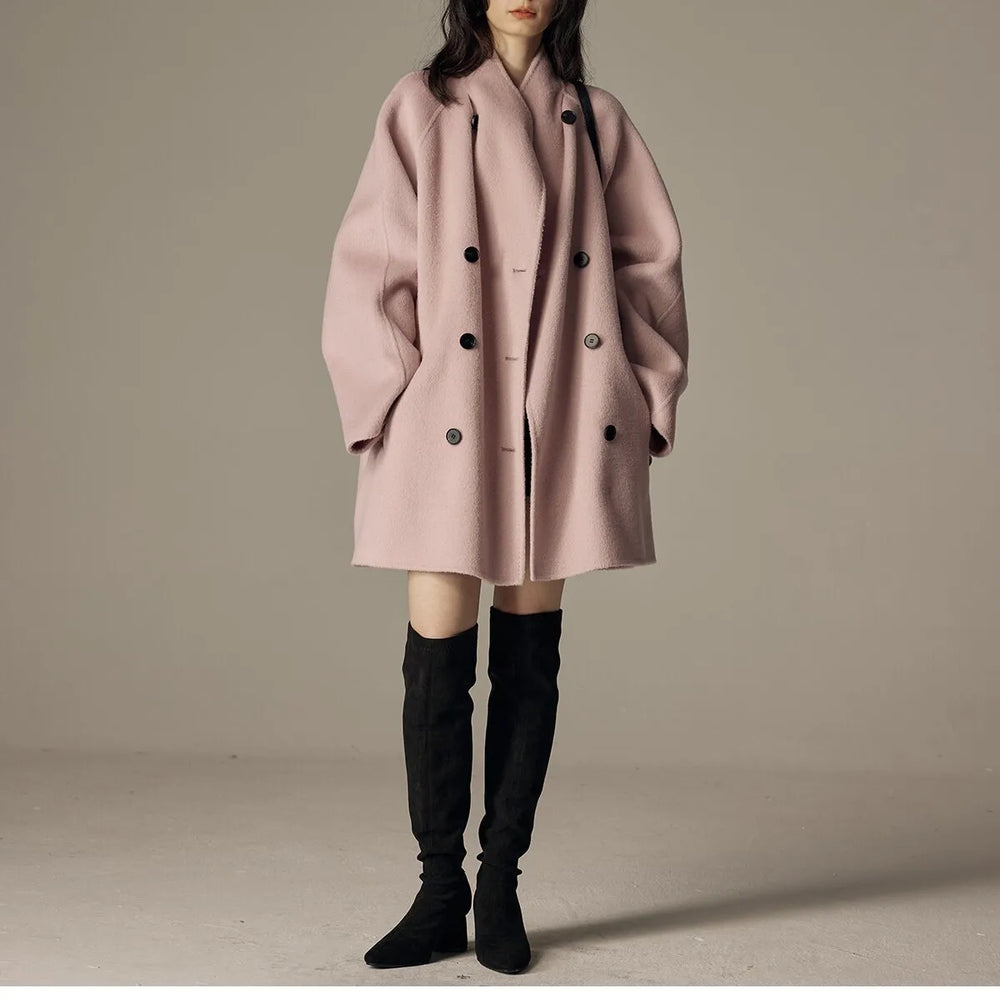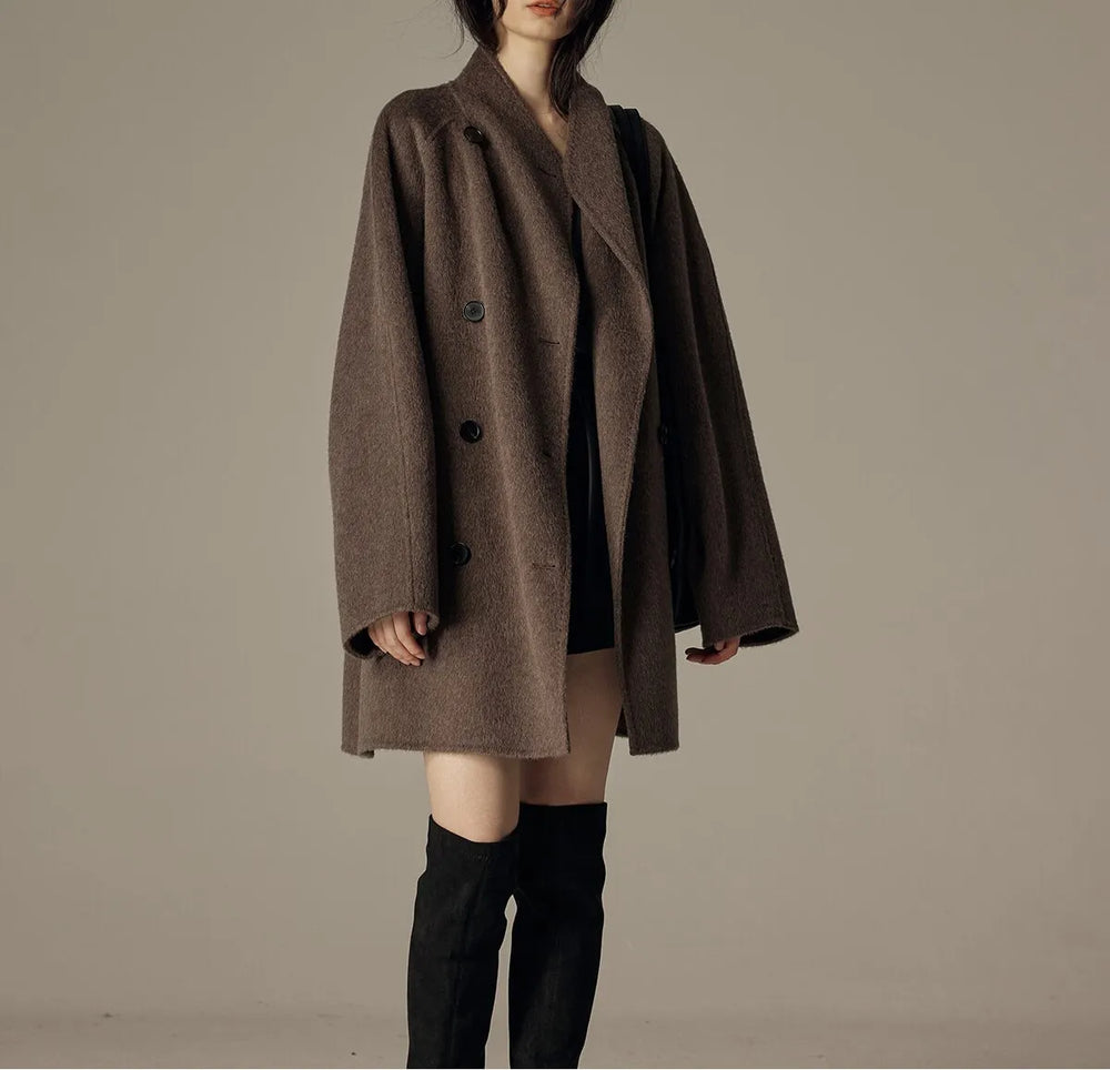 A casually elegant coat with a generous fit and soft drape. The shawl collar and double-breasted closure create a clean, modern silhouette, while the hidden side pockets make it practical for everyday wear. Mid-thigh length and slightly dropped shoulders make it easy to wear over everything from knitwear to dresses.