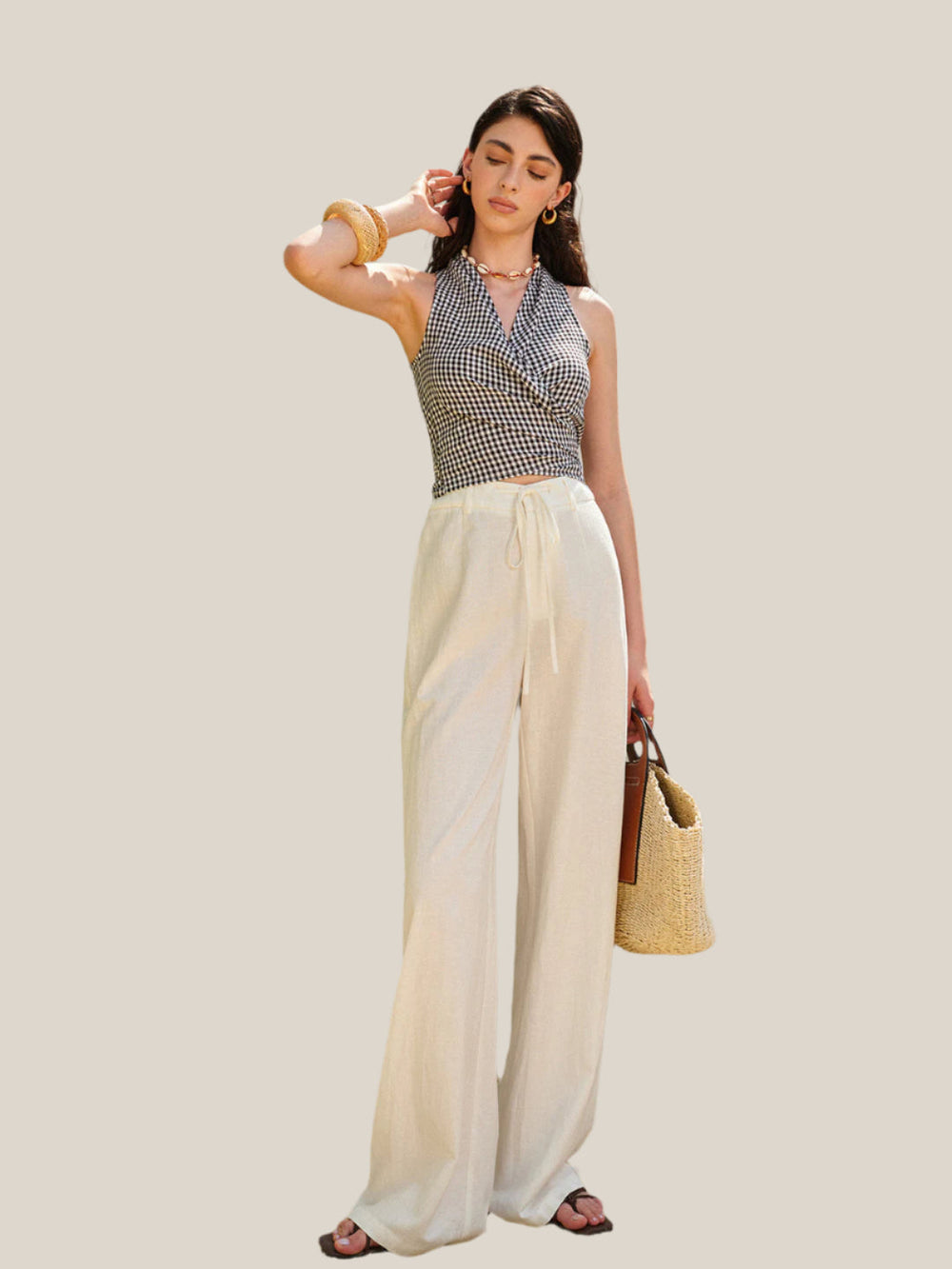 An elegant wrap top with a classic check pattern and a figure-flattering tie belt at the waist. Its gently draped neckline and sleeveless design create a feminine and timeless style, perfect for everyday wear and evenings out.