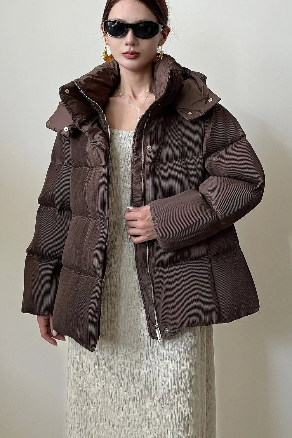 A statement puffer that defines the waist with a belt and has a high stand-up collar to keep in warmth. The detachable hood fastens with snaps for extra protection, and the hidden zipper with placket gives a clean look. The soft quilted channels add volume without being bulky, and side pockets warm your hands. An upgraded winter jacket that combines shape and comfort.