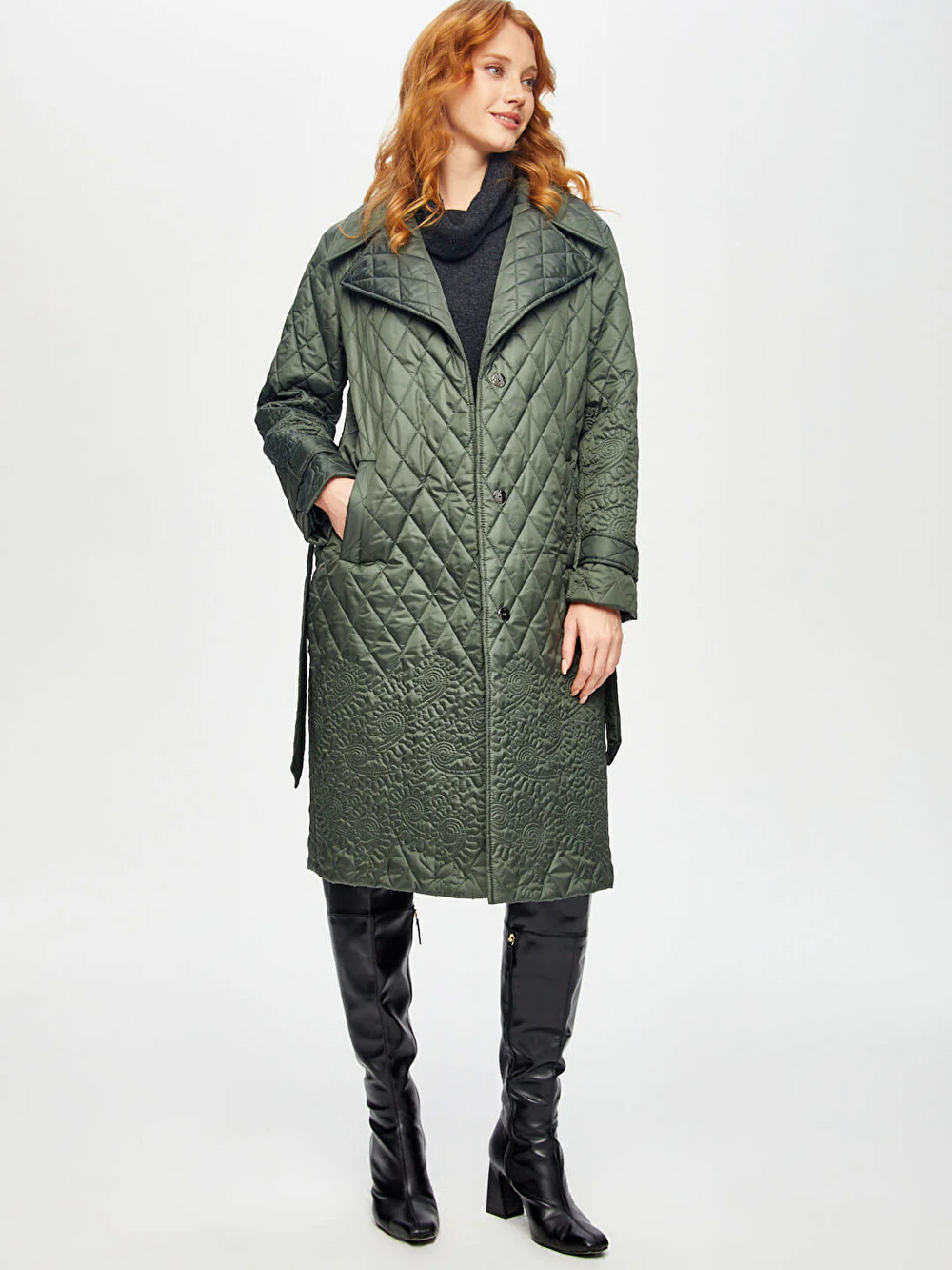A striking long coat with a combination of checks and floral quilting for an elegant structure. Wide lapels frame the neck and a tie belt defines the waist or lets the garment fall loosely. Lightly padded for warmth without being heavy, with a button-up front, turned-up cuffs and deep pockets. Calf-length that works equally well over knits, tailored or dresses.