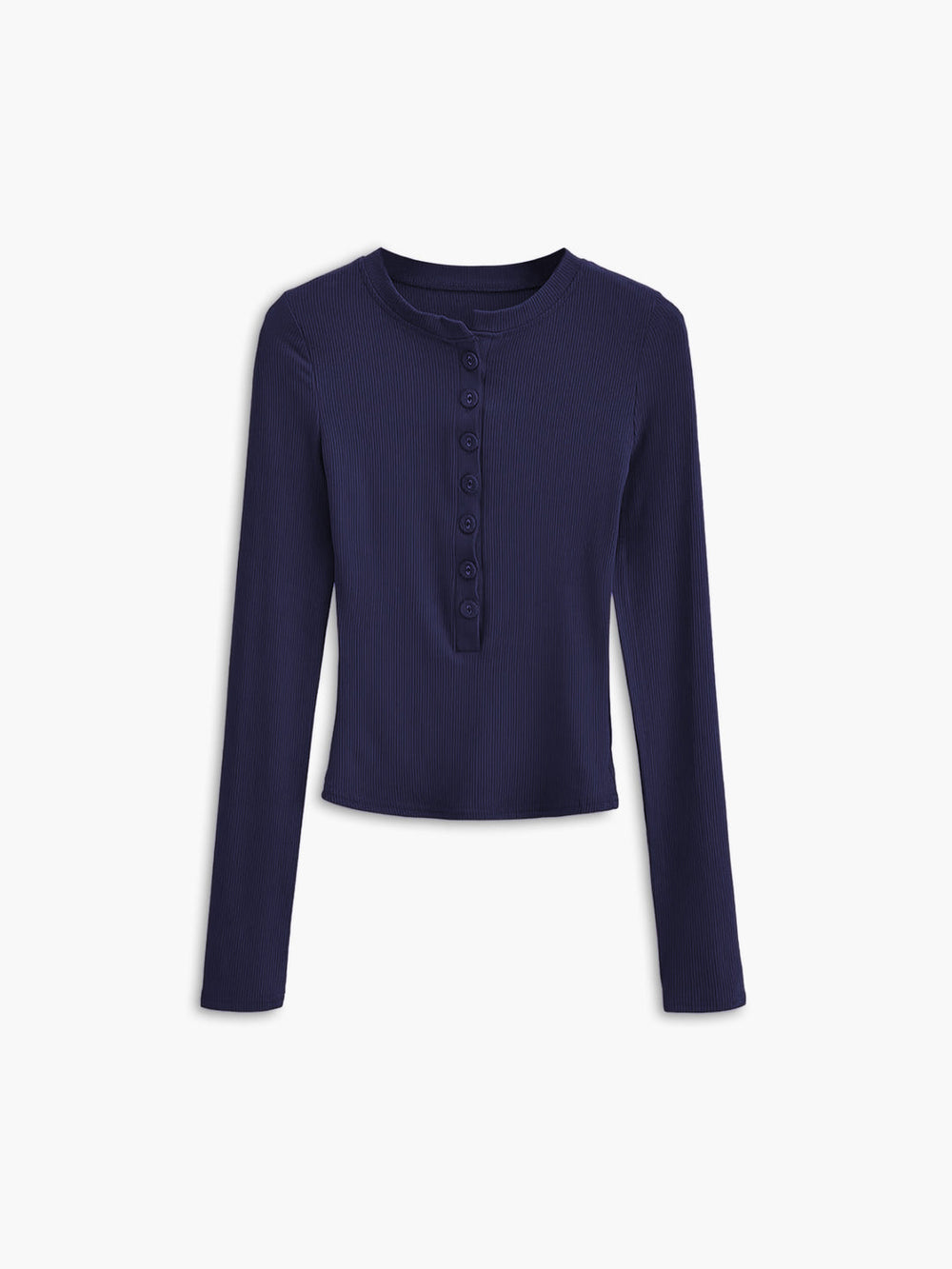 A classic ribbed top with long sleeves, a button-front closure, and a slim fit. Its timeless design and elegant buttons make it perfect for everyday wear and more casual occasions, as a basic piece or for a touch of elegance.