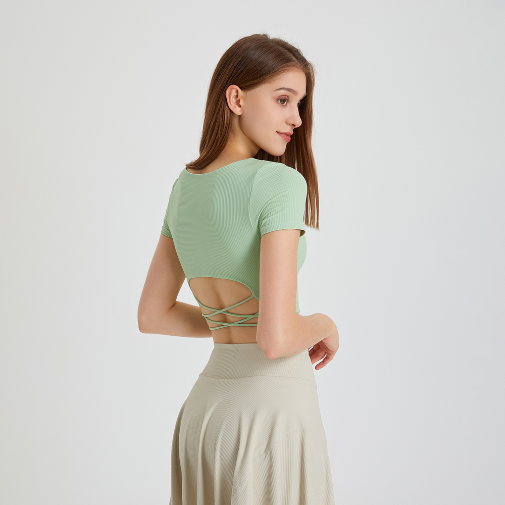 A trendy ribbed crop top with short sleeves and an elegant square neckline. Its fitted cut flatters your figure and pairs perfectly with cropped trousers or a skirt. A versatile piece for everyday wear as well as festive occasions.