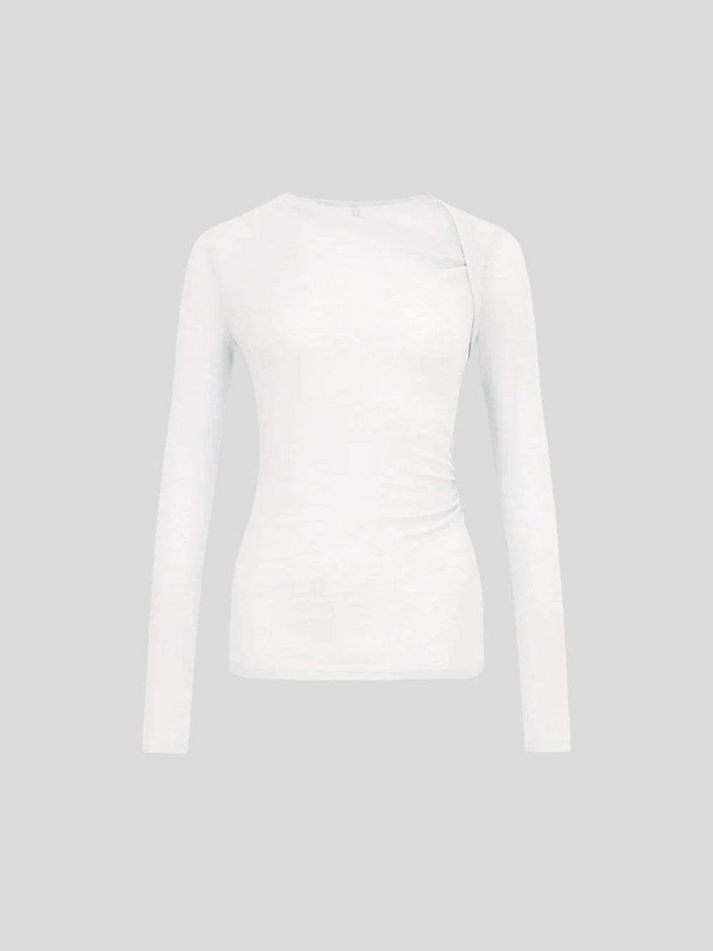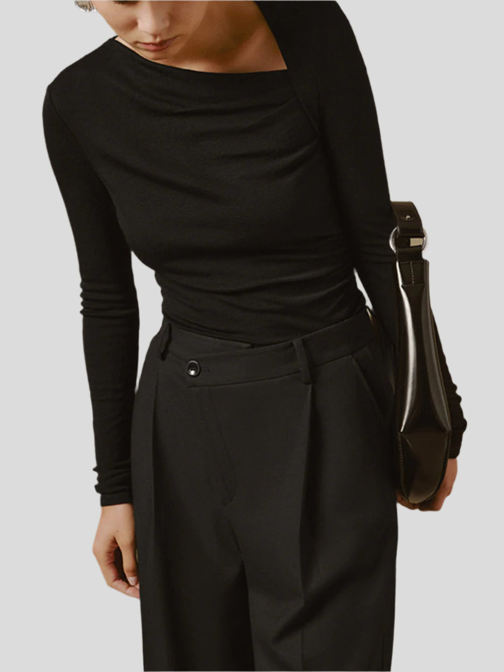 A sleek and modern top with long sleeves and a unique asymmetrical neckline that accentuates the shoulders. Its fitted cut creates an elegant and sophisticated look, perfect for everyday wear or evening wear.
