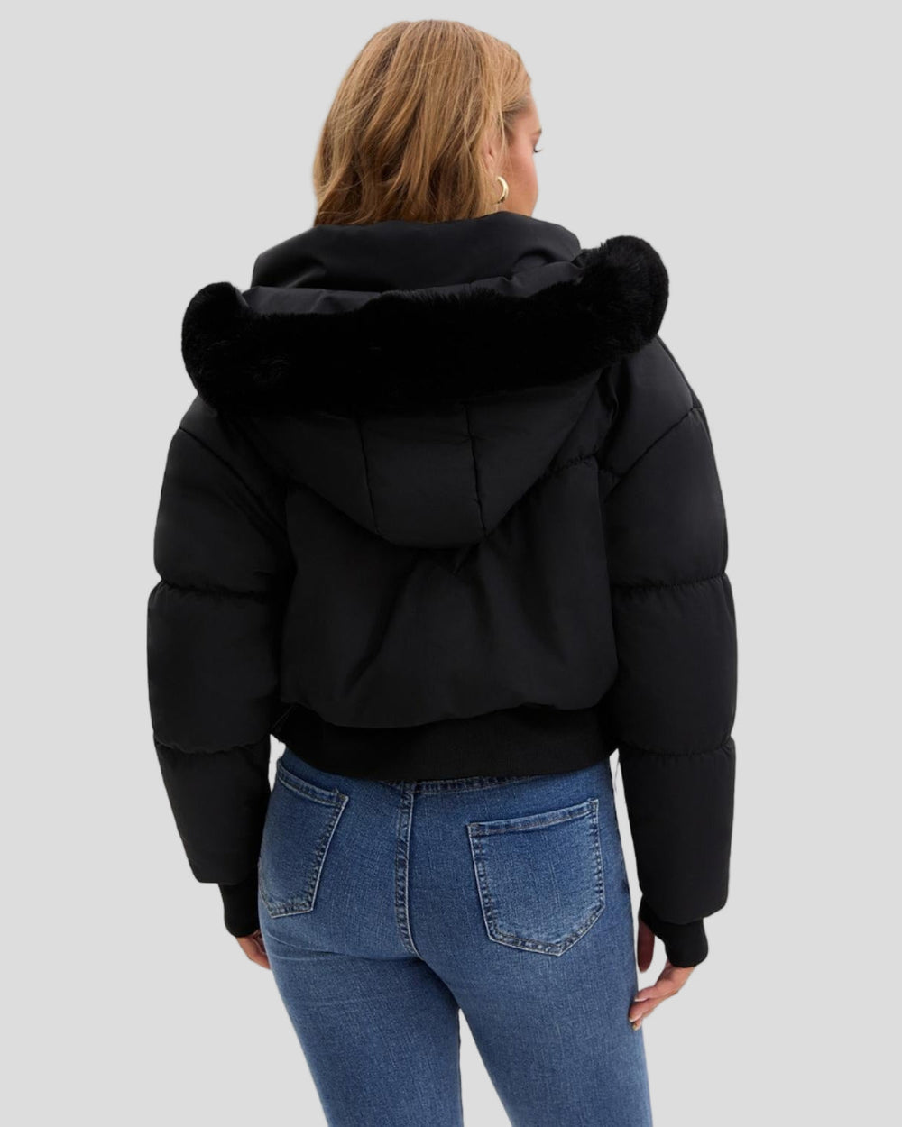 A warm, city-ready puffer in a cropped silhouette that highlights the waist. The high collar and hood provide extra coverage, and the full-zip closure makes layering easy. A wide ribbed hem sits firmly against the body, and soft inner cuffs with thumbholes keep the sleeves in place and lock in the warmth. Lightweight but cozy - easy to match with high-waisted jeans and leggings for everyday wear.