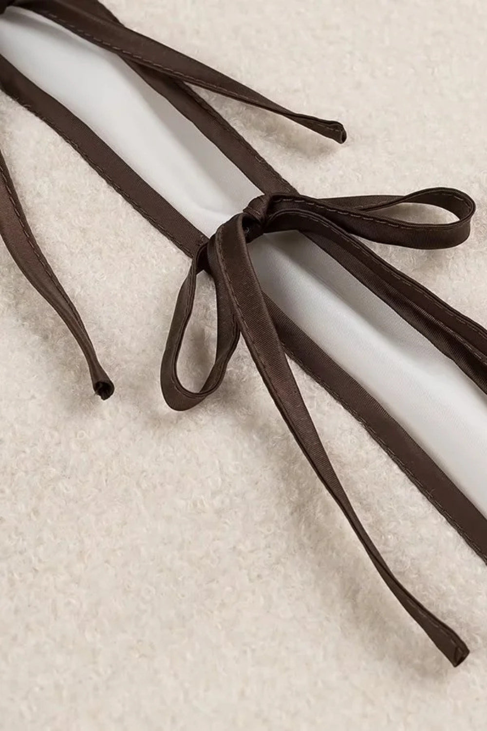 Soft, textured jacket in white, accented with contrasting taupe piping. Dropped shoulders, front opening with thin ties, and a cropped length—perfect over a T-shirt, dress, or jeans.