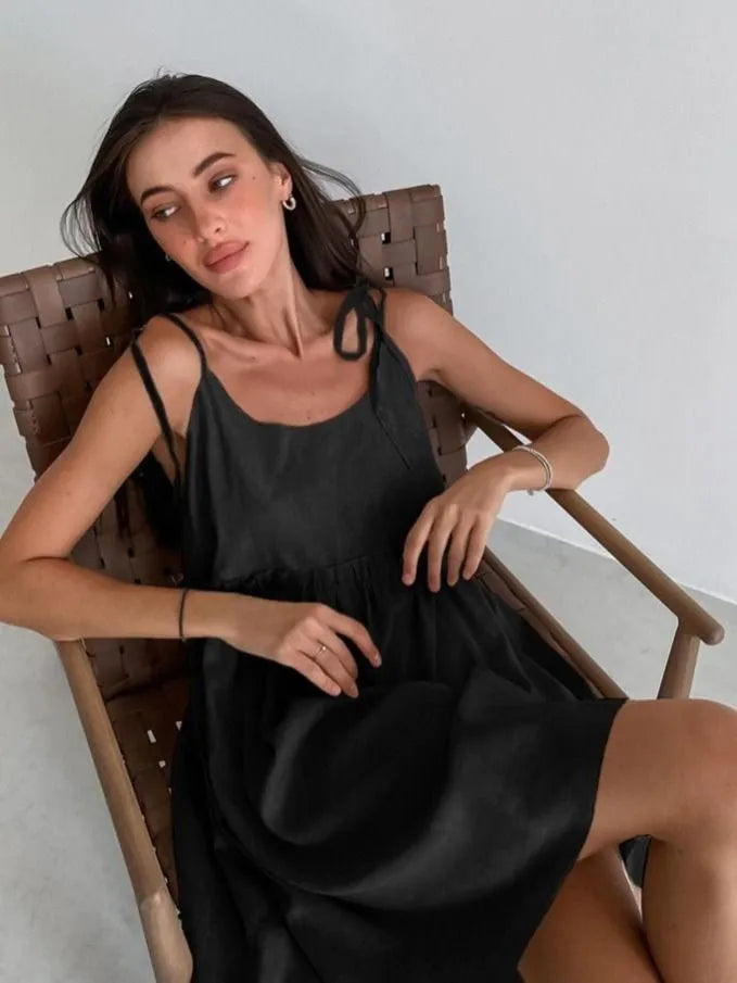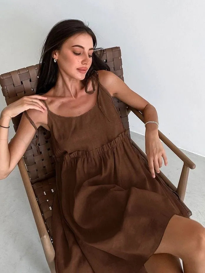 This sleeveless mini dress features adjustable tie straps and an elasticated waist for a comfortable, flattering, and airy fit. Its soft, lightweight fabric feels great against the skin and offers great freedom of movement, ideal for warmer days. With its full skirt and simple cut, this dress is perfect for casual wear, vacations, or simply enjoying a sunny day.