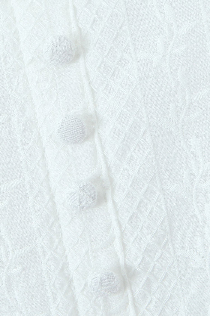 This sleeveless mini dress has a button-front closure and a fitted bodice. The skirt is wide and decorated with a lace trim. This creates a playful and elegant look, ideal for both casual and festive occasions.