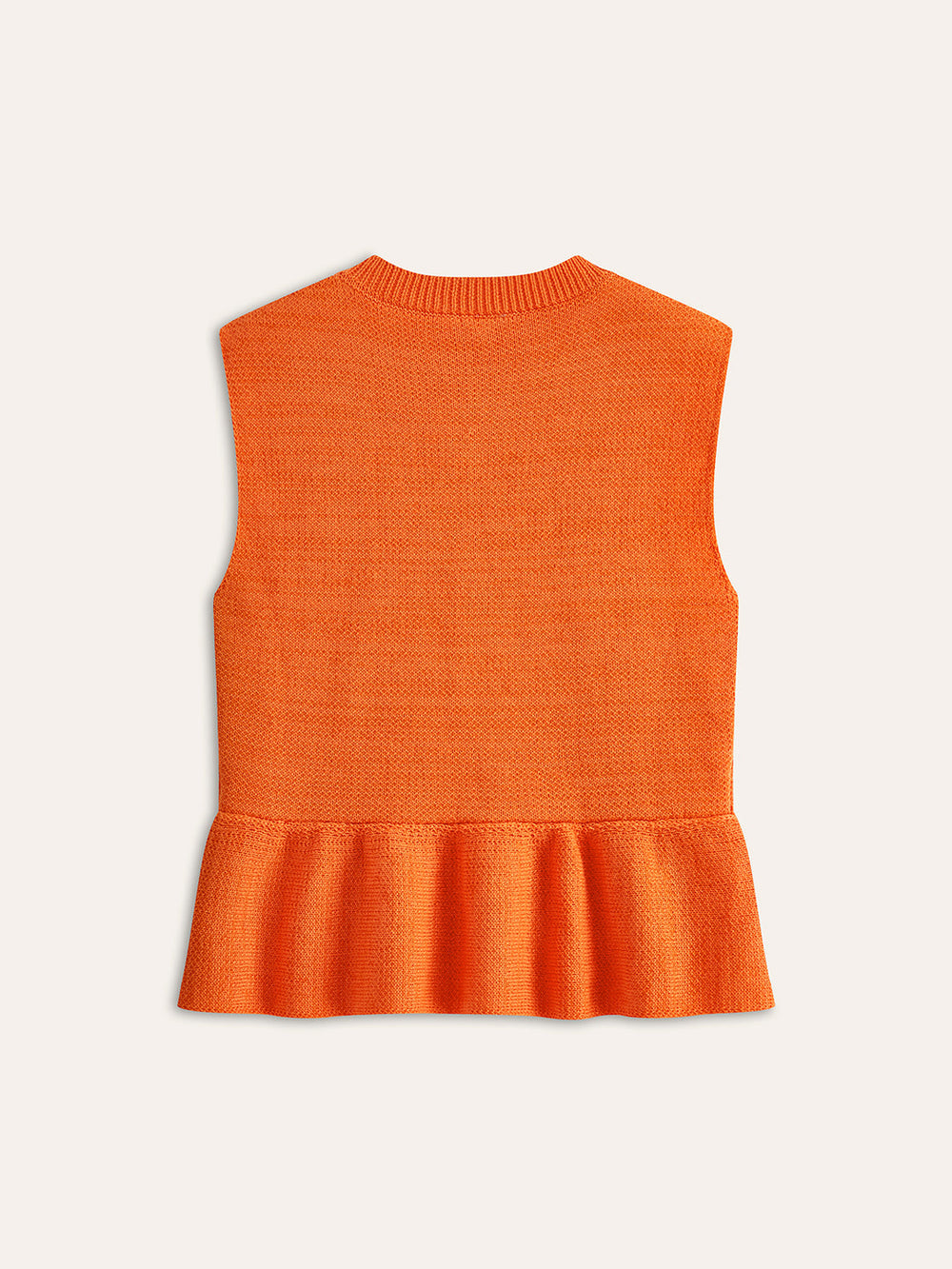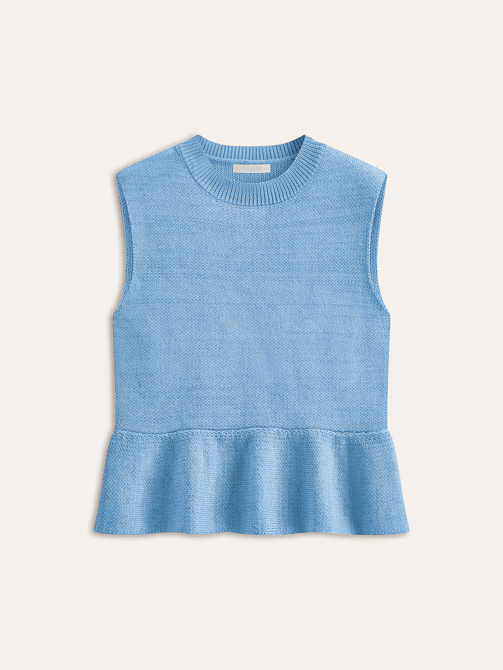 An elegant sleeveless top with a feminine ruffle along the hem. Its knitted texture offers a warm and soft feel, ideal for layering or as a stylish summer top.