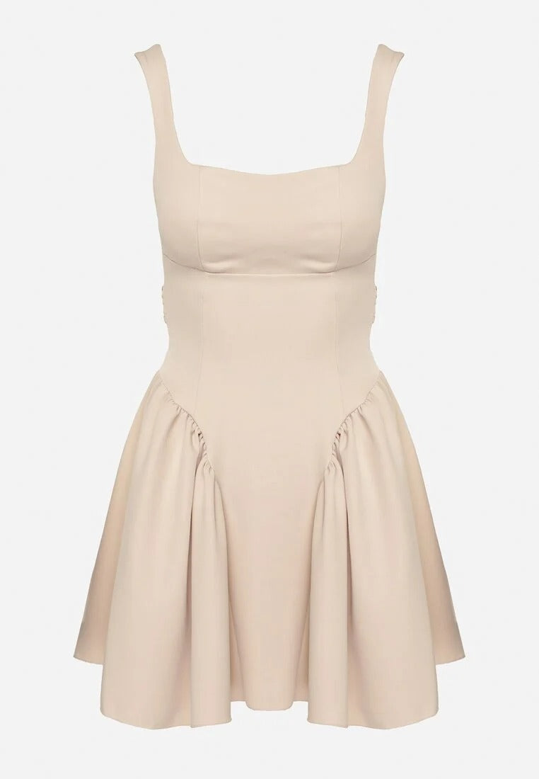 Refresh your wardrobe with this sleeveless, square-neck mini dress. The fitted bodice, wide straps, and flared skirt with pleated details create a playful yet elegant silhouette. Ideal for brunch, a night out, or any occasion where you want to show off a feminine look.