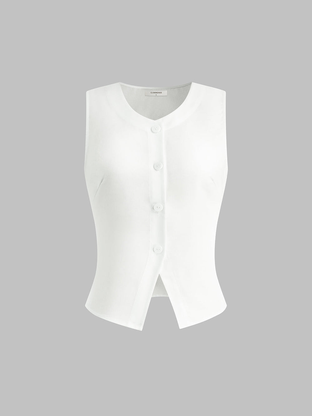 Modern and elegant sleeveless top, buttoned at the front and slightly flared. A versatile piece for everyday wear as well as more formal occasions.