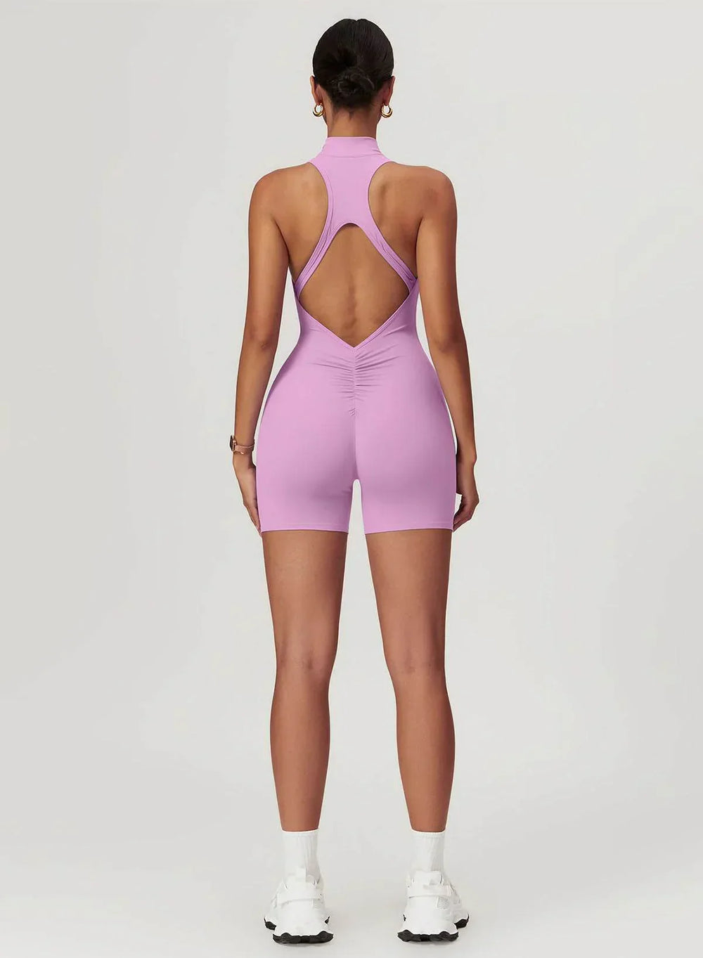 Sleek one-piece featuring a high neckline and front zip for easy on/off and adjustable airflow. The body-hugging fit and short legs create a smooth, sporty silhouette that moves with you. Sleeveless cut and clean back make it ideal for workouts, power walks, or an athleisure look layered under an oversized cardigan. Wear it solo or layered—comfortable, streamlined, and ready for everyday performance.