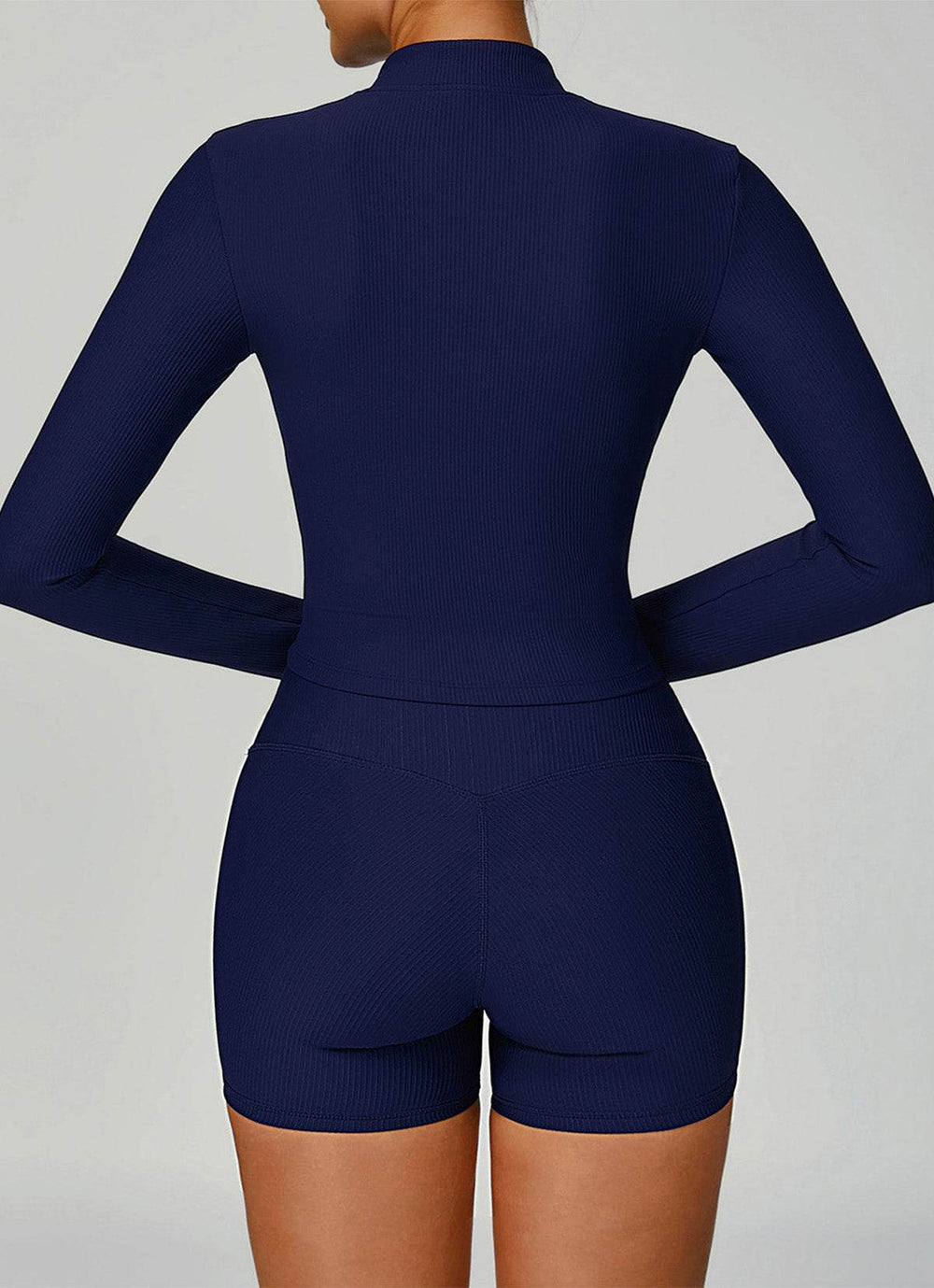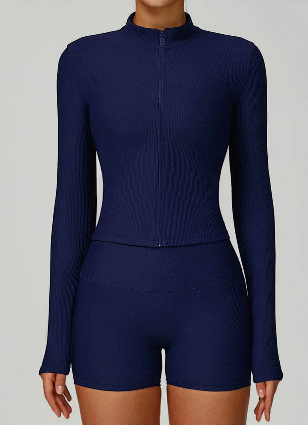 This sporty set consists of a fitted zip-up top and comfortable shorts. Ideal for intense workouts as well as relaxing days.