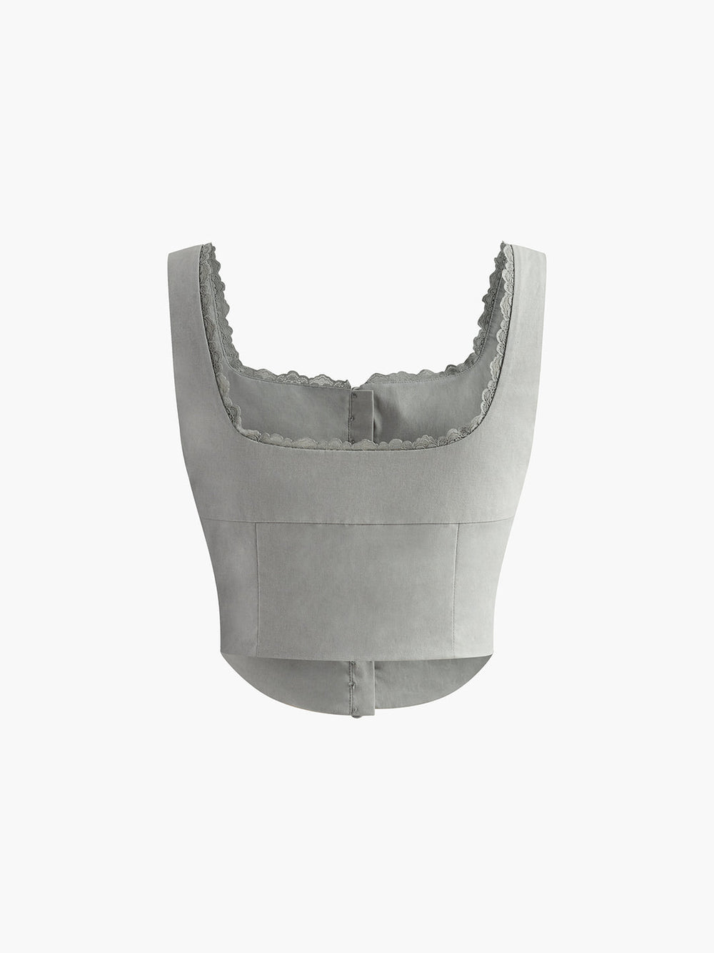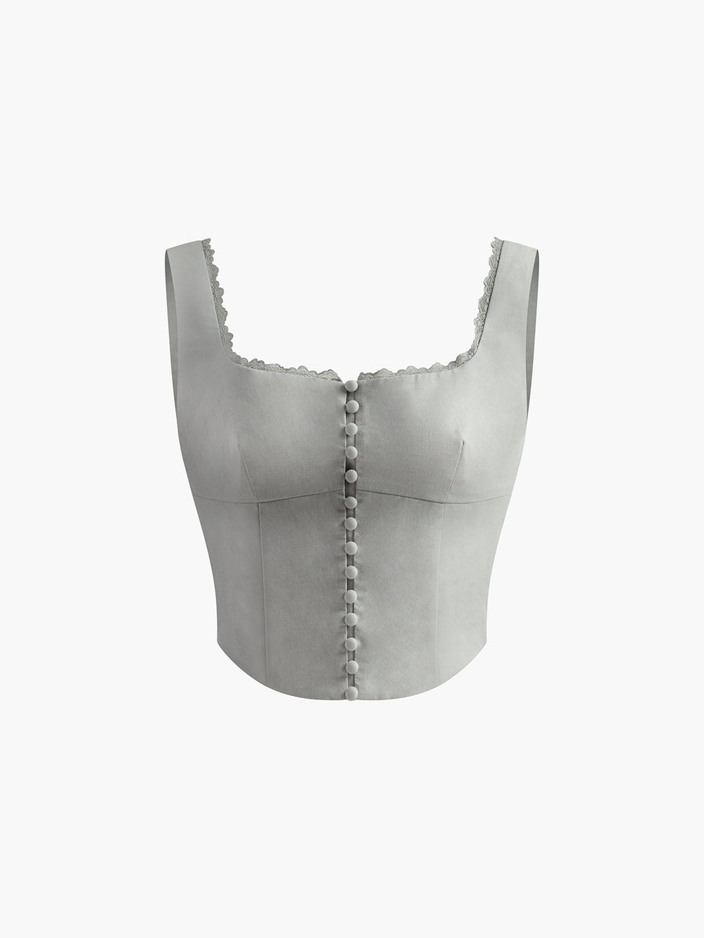 A romantic corset with detailed buttons on the front and a pretty lace trim along the neckline. Its close-fitting cut accentuates the waist and creates an elegant and feminine look, perfect for festive occasions or evening wear.