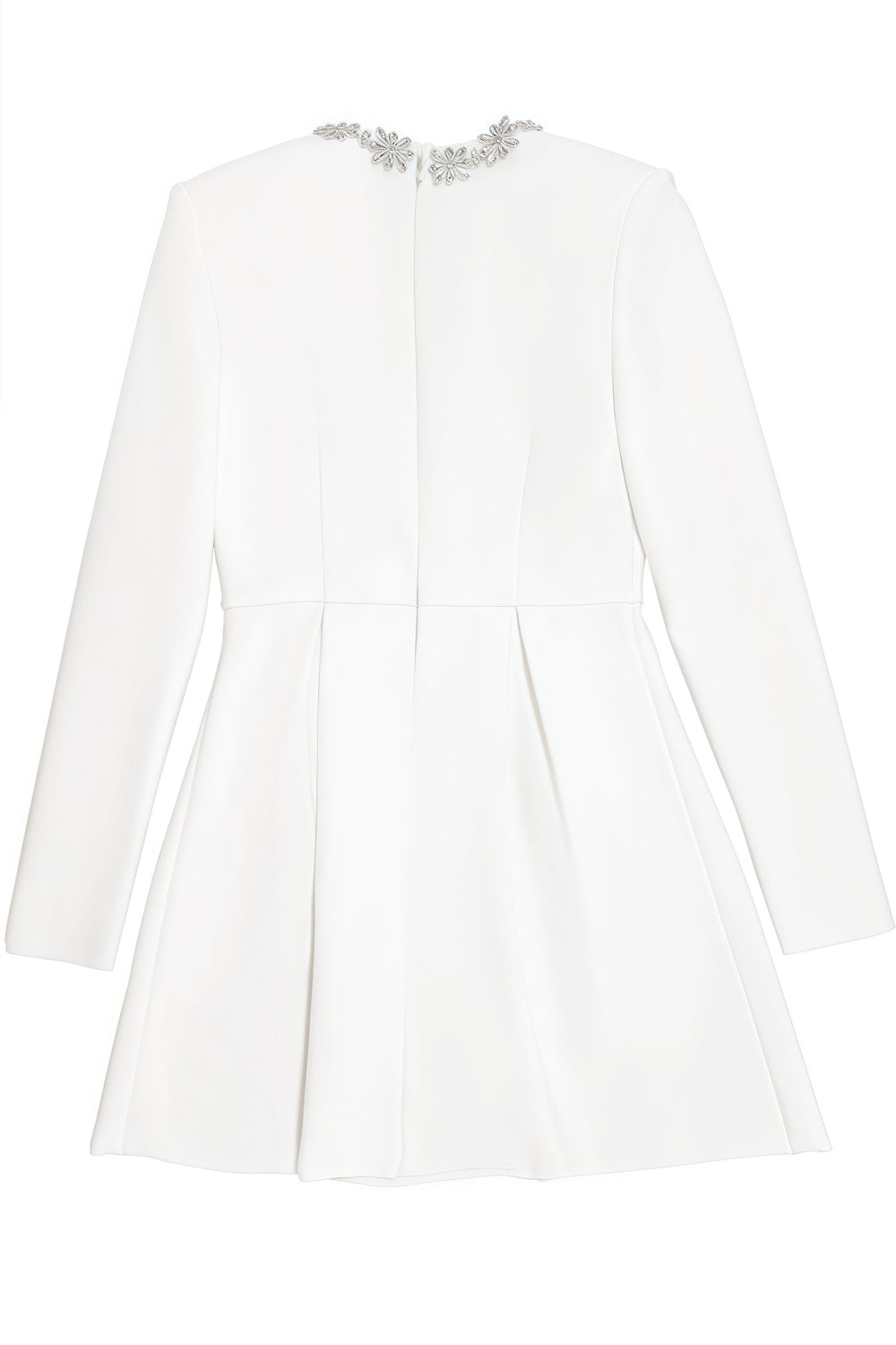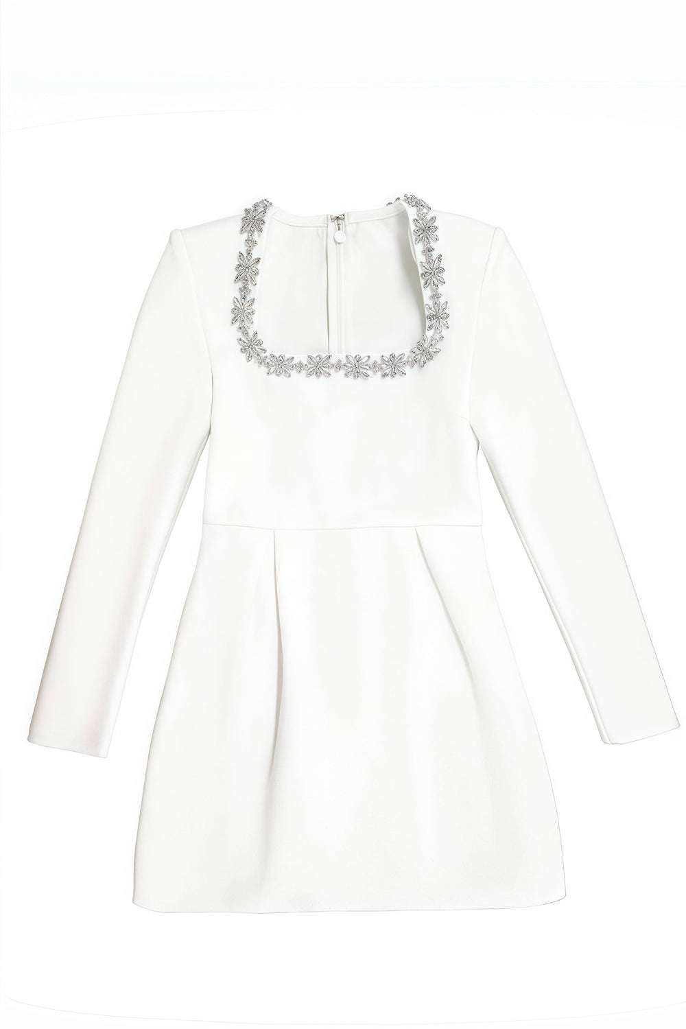 Elegant white mini dress with long sleeves and a square neckline, beautifully adorned with sparkling stones. Thanks to its fitted cut and exclusive details, this dress is ideal for weddings, parties, or any other special occasion where you want to display luxury and elegance.