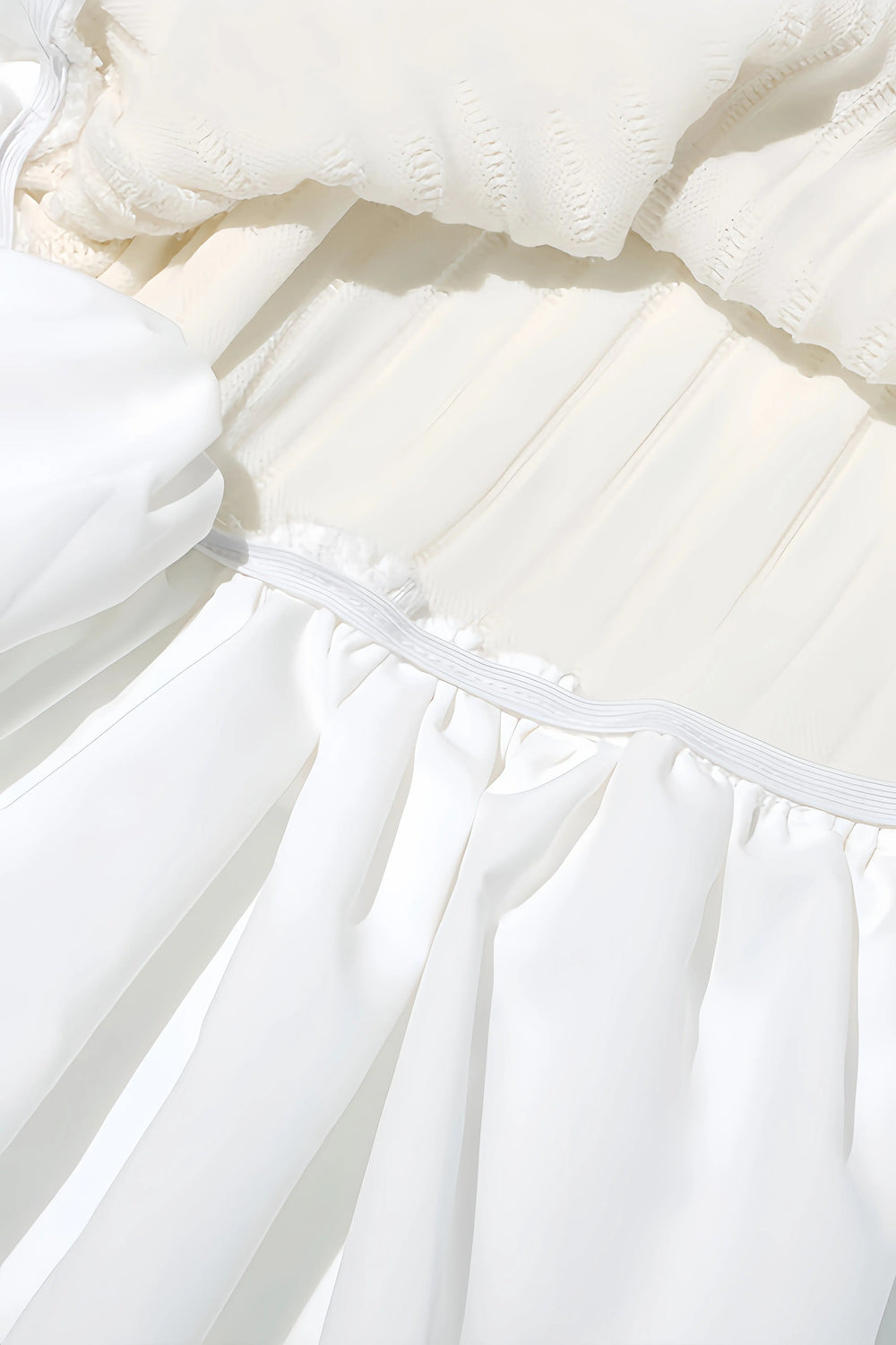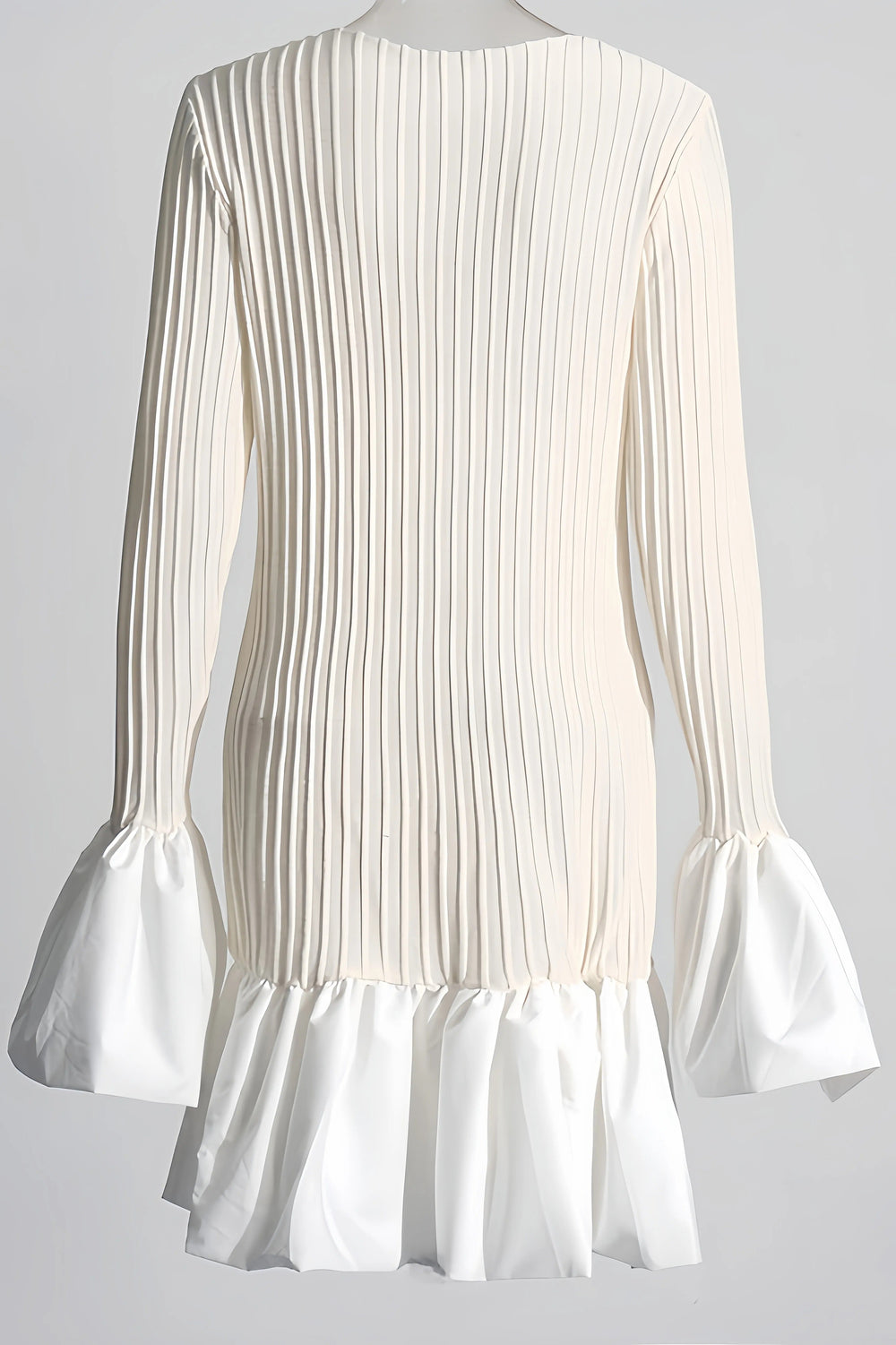An elegant white mini dress with long sleeves, pleated structure, and voluminous cuffs and hem. Its fitted cut, combined with flared details, creates a refined and modern look, ideal for parties and elegant occasions.