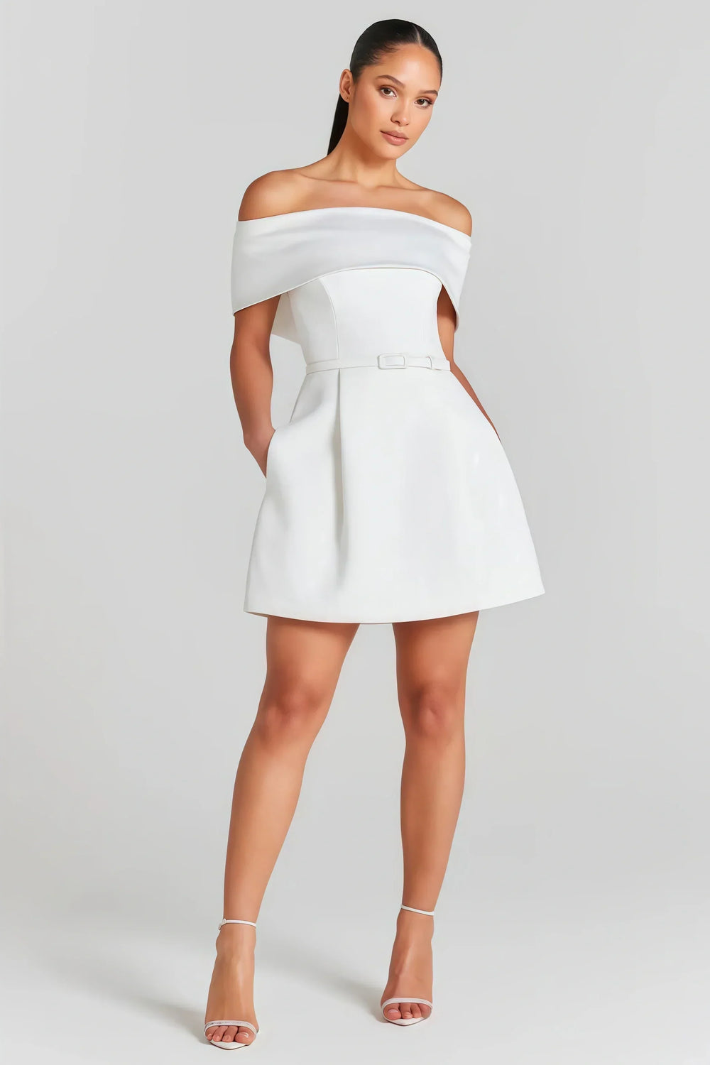 Elegant white mini dress with a tie shoulder and a subtle keyhole cutout at the front. Its slim fit creates a sophisticated and feminine look, perfect for weddings, parties, or any other special occasion where you want to feel extra elegant.