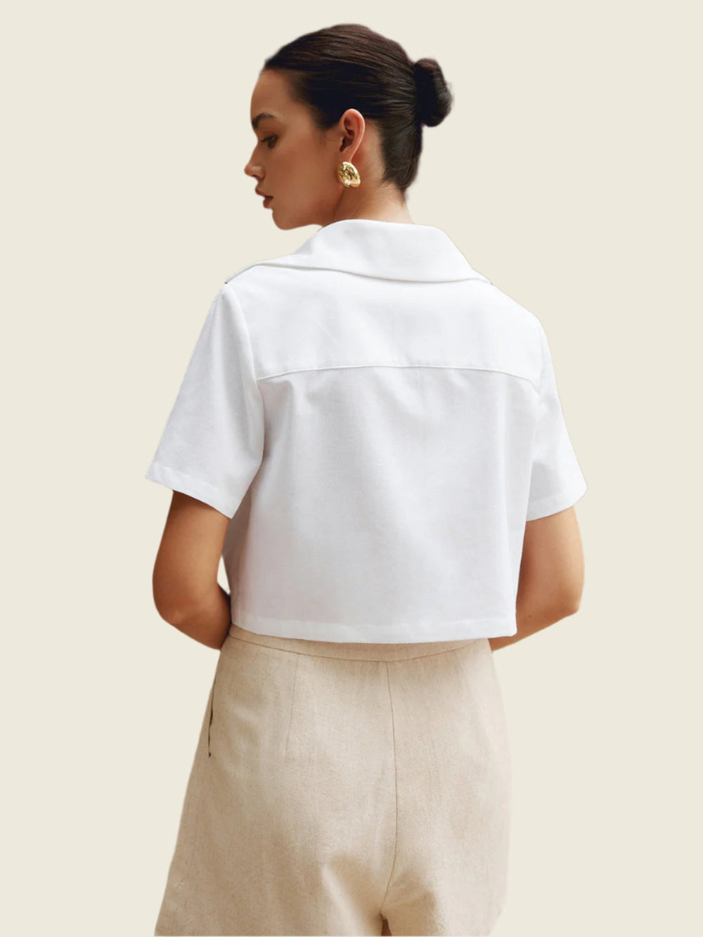 A smart and casual white shirt with short sleeves and two decorative chest pockets. Thanks to its short cut and fresh color, this piece is perfect for a modern and contemporary everyday style.
